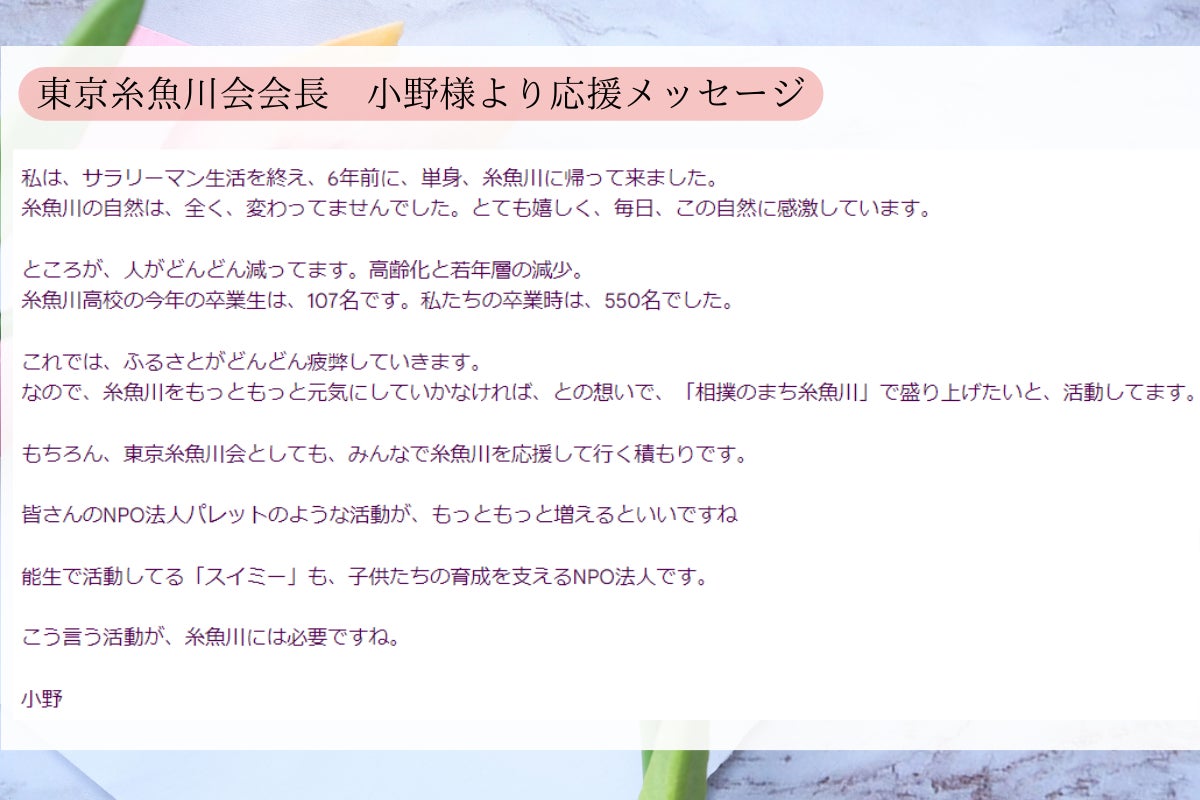 東京糸魚川会会長 小野様からもメッセージを頂戴しましたのでご紹介させて頂きます。