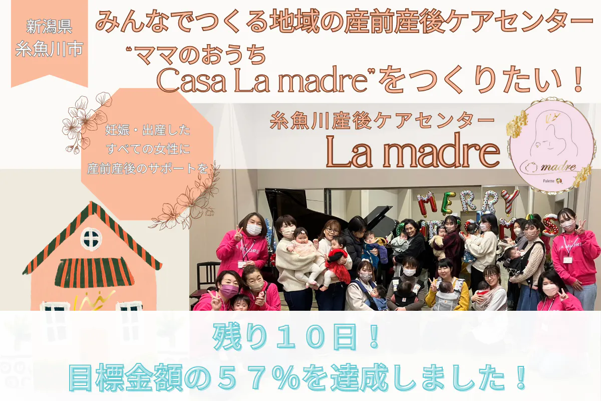 産科医療において"陸の孤島"となりつつある糸魚川。糸魚川で産み育てることに、不安や孤独を抱えているママたちの産前・産後に寄り添っていきたい。活動を継続そして、発展させていくための拠点“Casa La madre”にふさわしいおうちをこの度購入することを決めました!皆様のご支援を宜しくお願い致します!