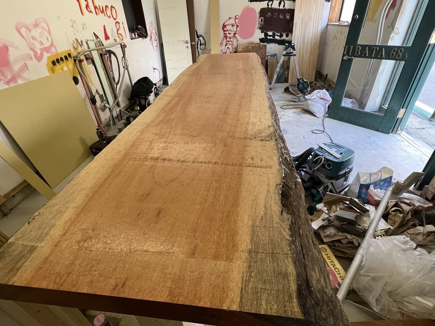 ちなみにこの天板はカウンターになります。とても立派な天板じゃないですか!?この木材屋の社長さんが、とても豪快な方で、おまけにyabucogiの看板用の木材もくれたので、yabucogiの看板を子どもたちと一緒に作っています笑