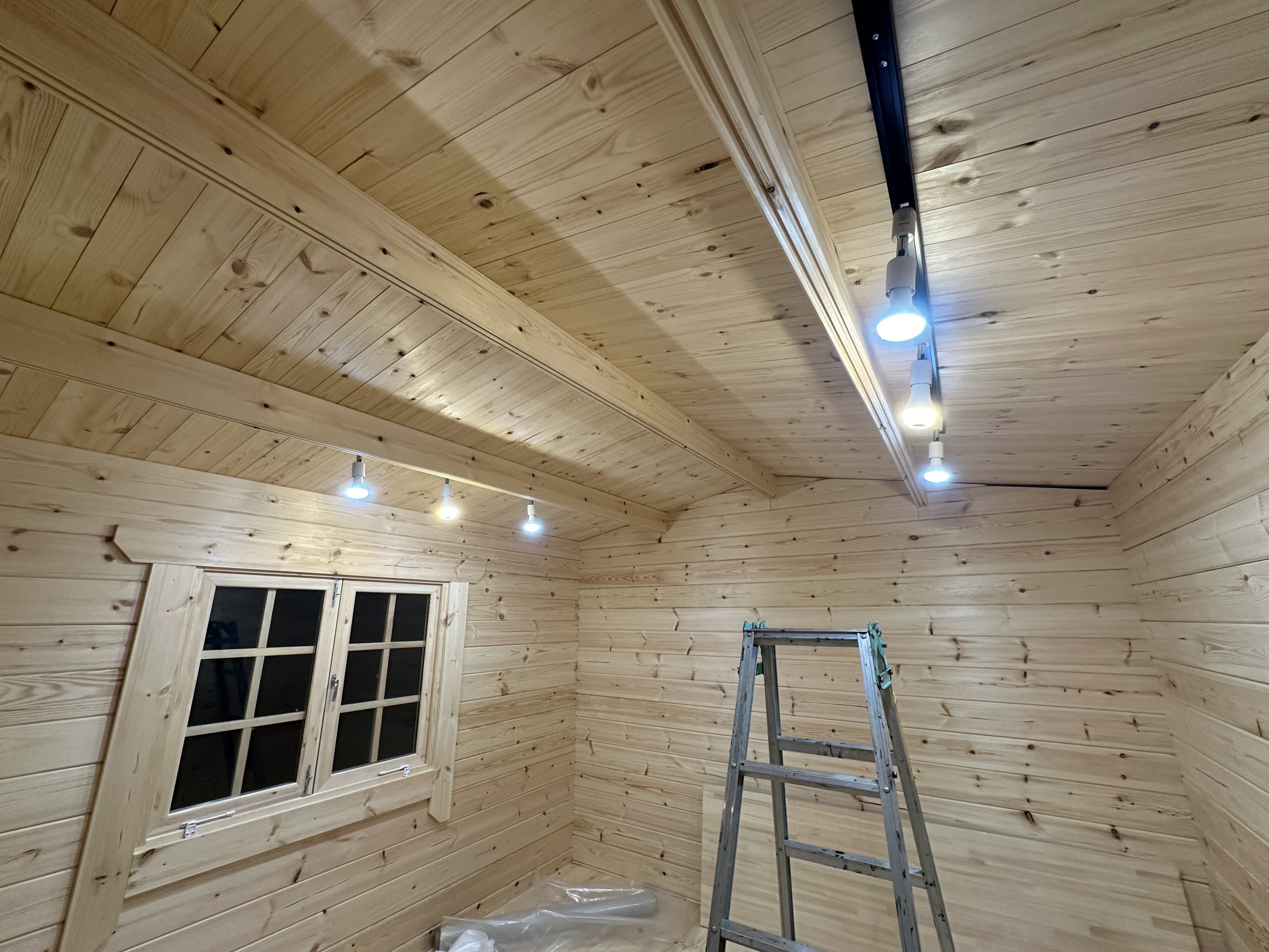 工房本体が完成しました!一日だけプロにお手伝い?をお願いしました。外側を塗装し室内灯を設置あとは道具を運び込むのみです!もう少し!