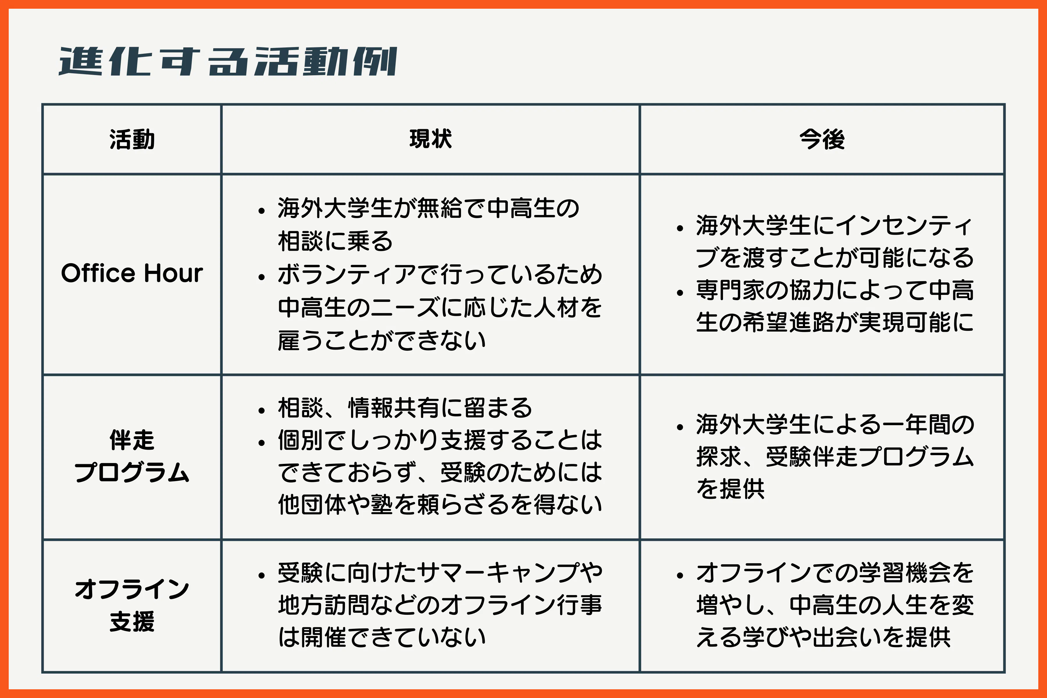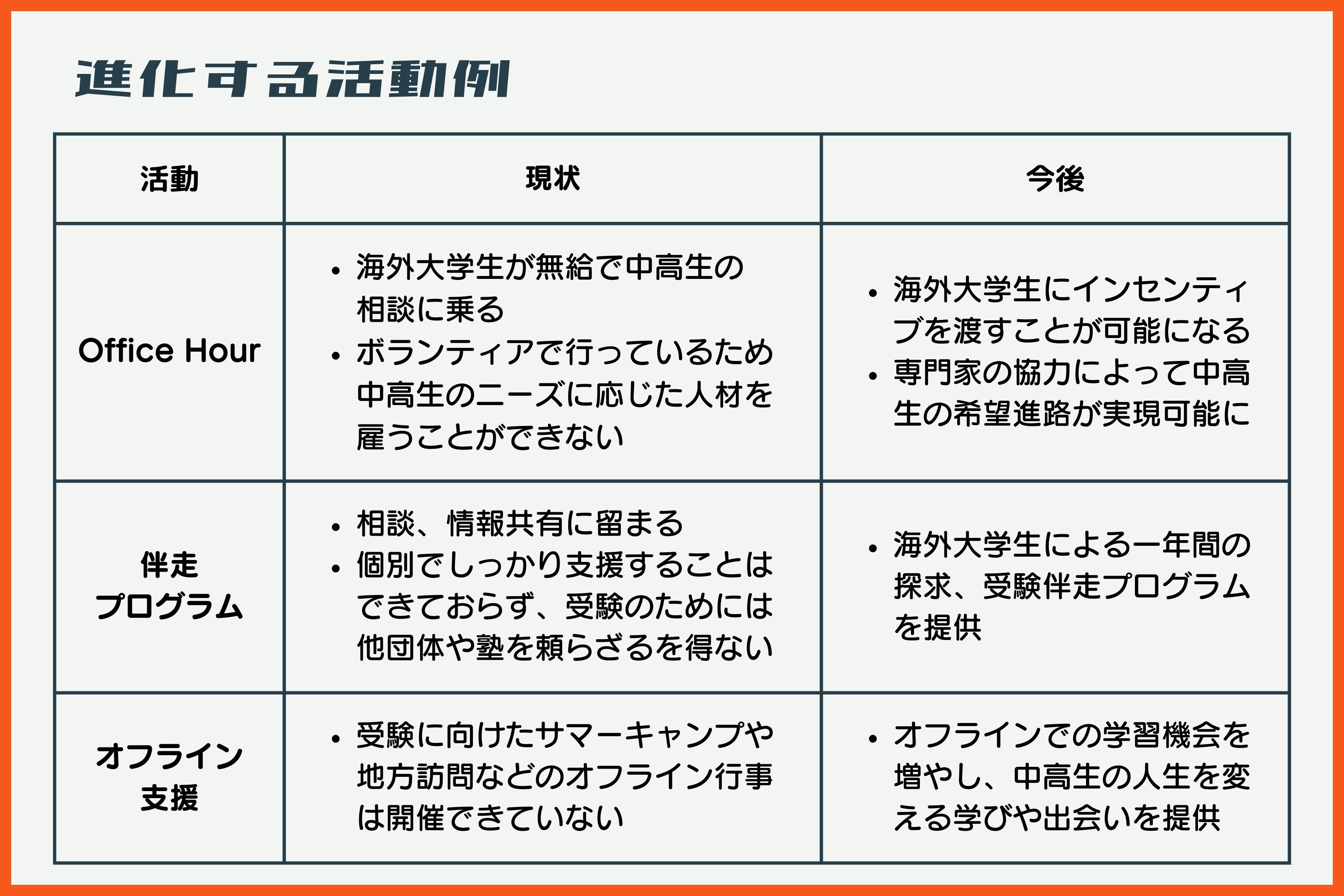 海外大学進学の際に提出するエッセイや課外活動の実績では、志望者の個性を出す必要があります。つまり、各志望者の個性を理解したメンターによる、少人数を対象とした支援・伴走プログラムが欠かせないのです。しかし、質が高い既存の伴走プログラムは60万円から100万円ほどの負担を強いられるものが大半で、経済的に諦めてしまう中高生も数多くいます。また、多くのサポートプログラムは高校三年生を対象としており、長期の支援・探求が必要な自己分析や課外活動についても、高校二年生以下の中高生自身が手探りで進めていかなければいけないのが現状です。
