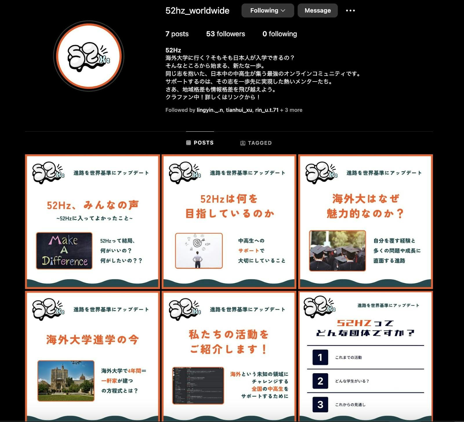 この『52Hz』 は経済状況や所属先に関わらず、誰でも参加すること可能な、長期的に持続するコミュニティとなることで、海外大学進学をゴールとして据える人だけでなく、国内大学との併願を行う人や海外大学に少し興味を持ち始めた人など、海外大学進学の様々な段階にいる人が仲間を見つけ、学びあい、成長することを可能にしています。