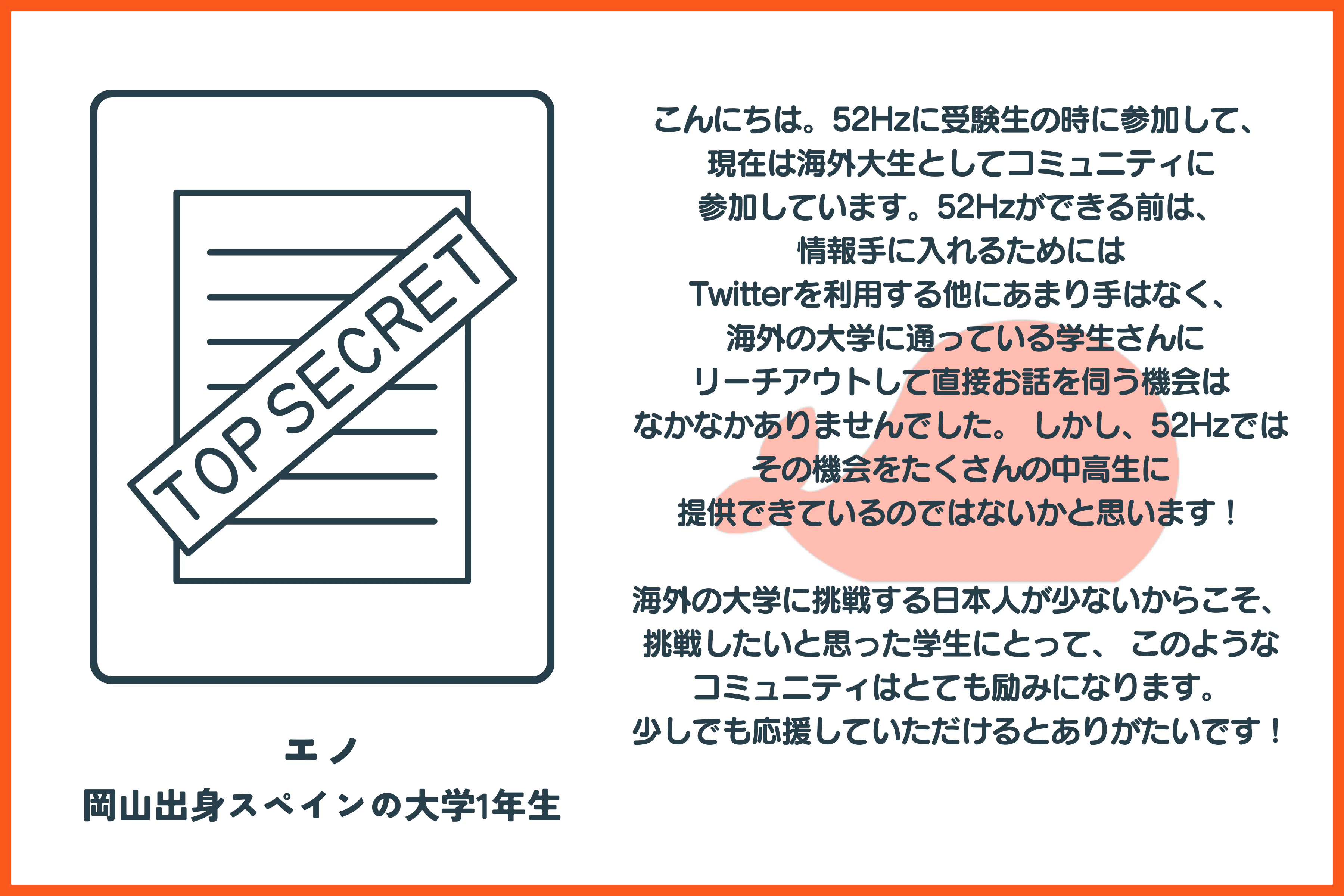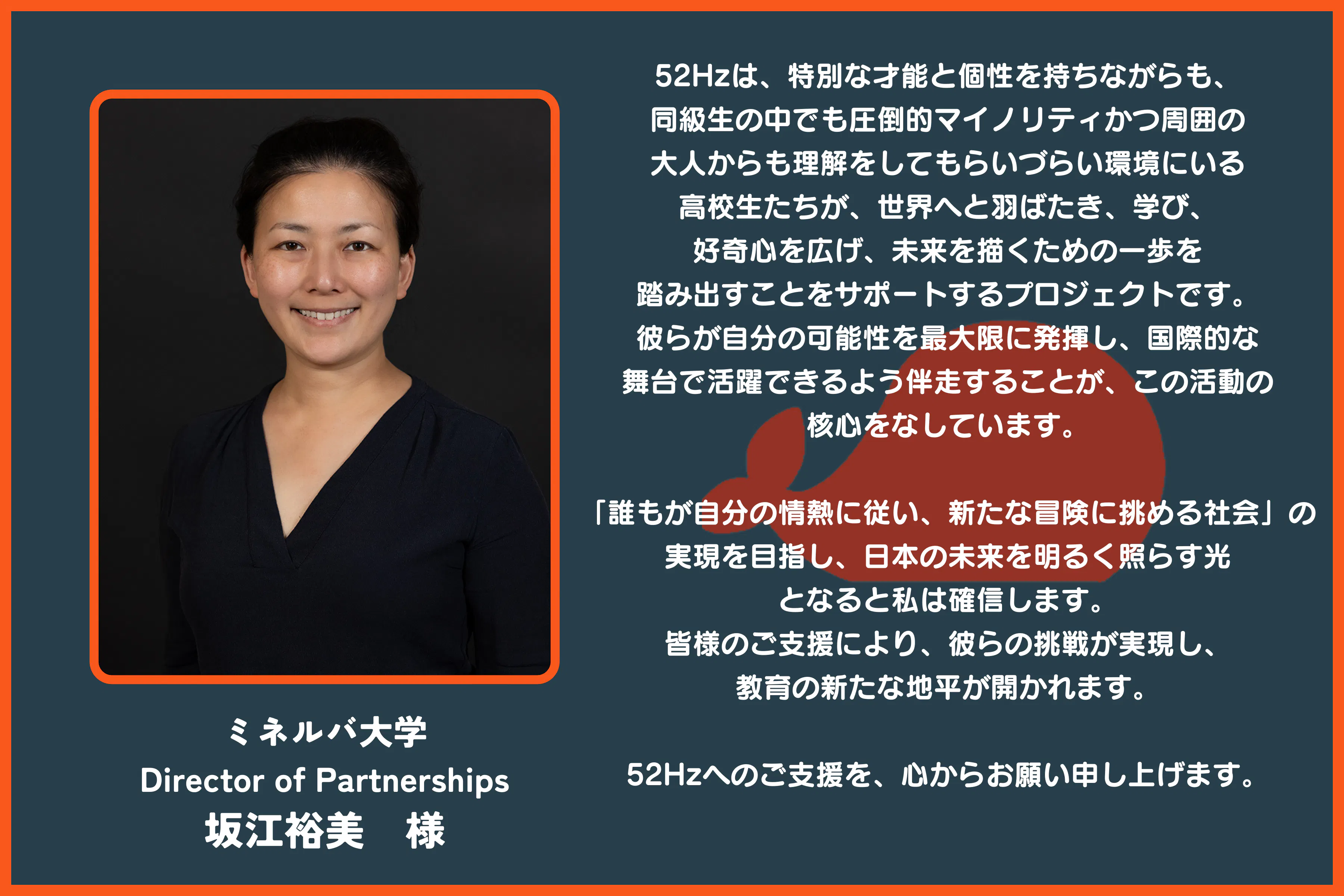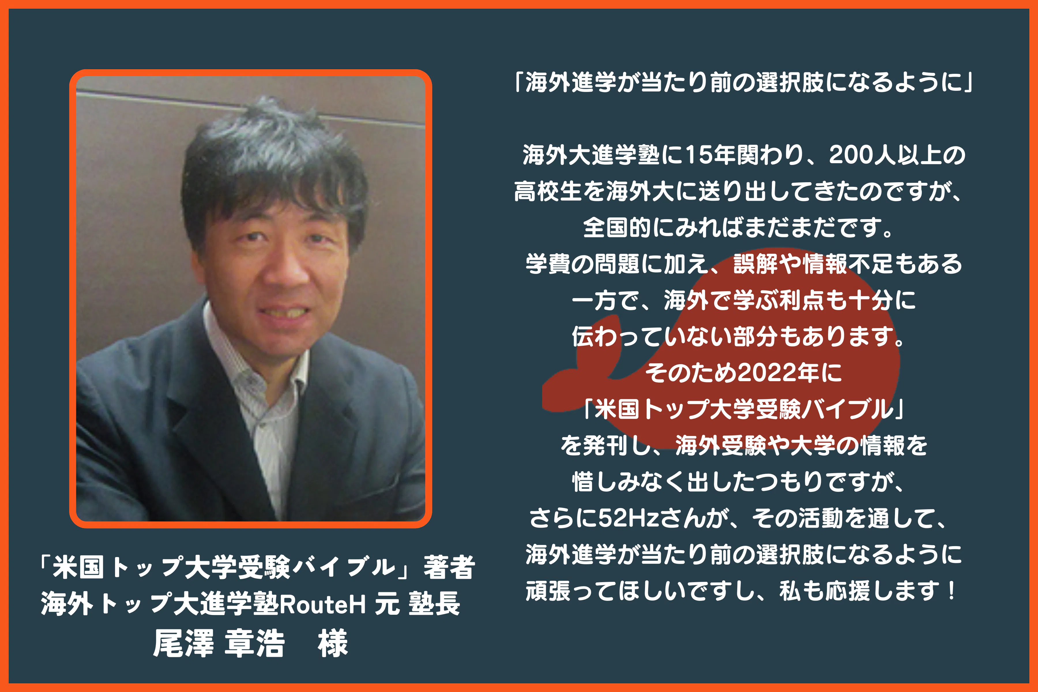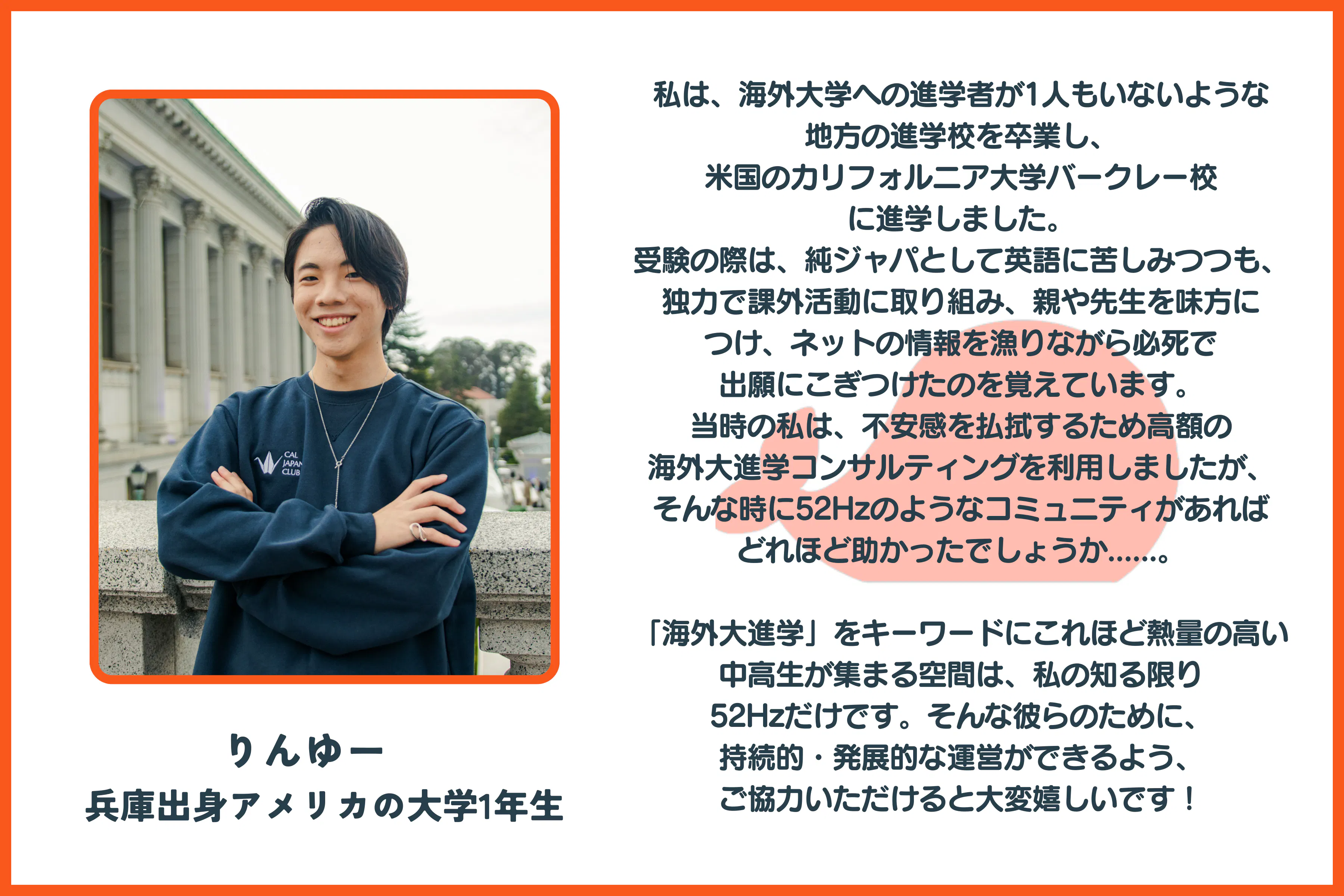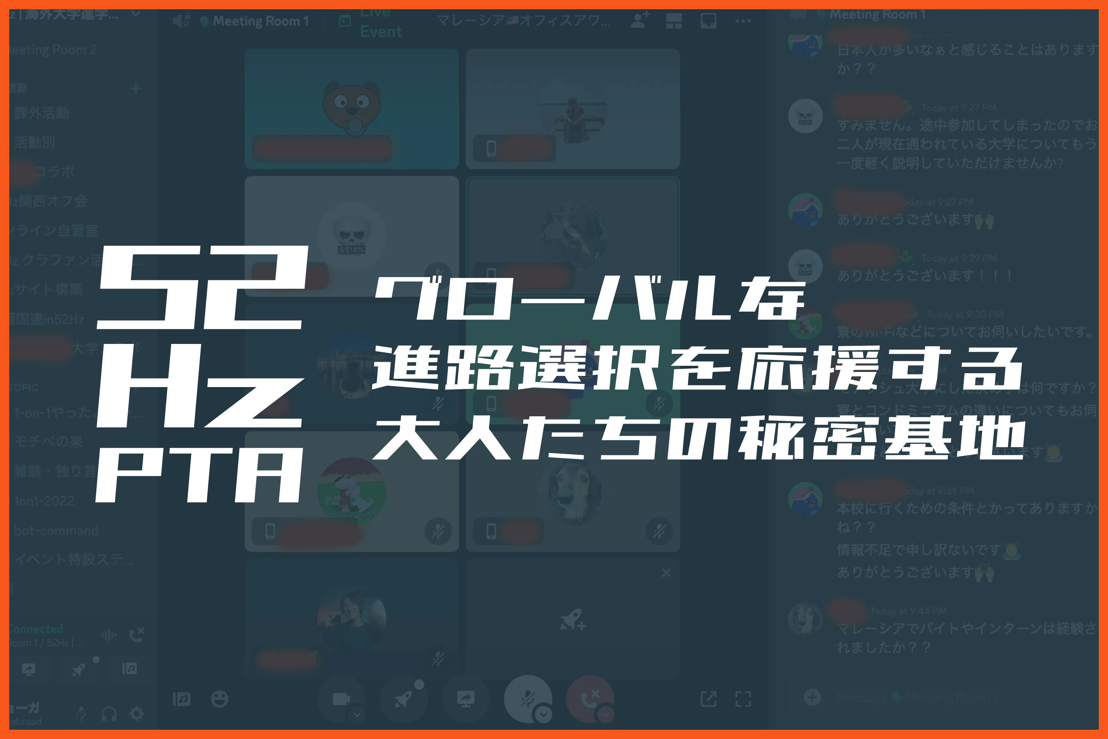 また、15200円以上の本格応援プランでご支援いただいた方には、海外大学進学に関心のある保護者・教育関係者が、グローバルな進路選択について学び合うオンラインコミュニティ、52Hz PTA (仮)に先行招待させていただきます!