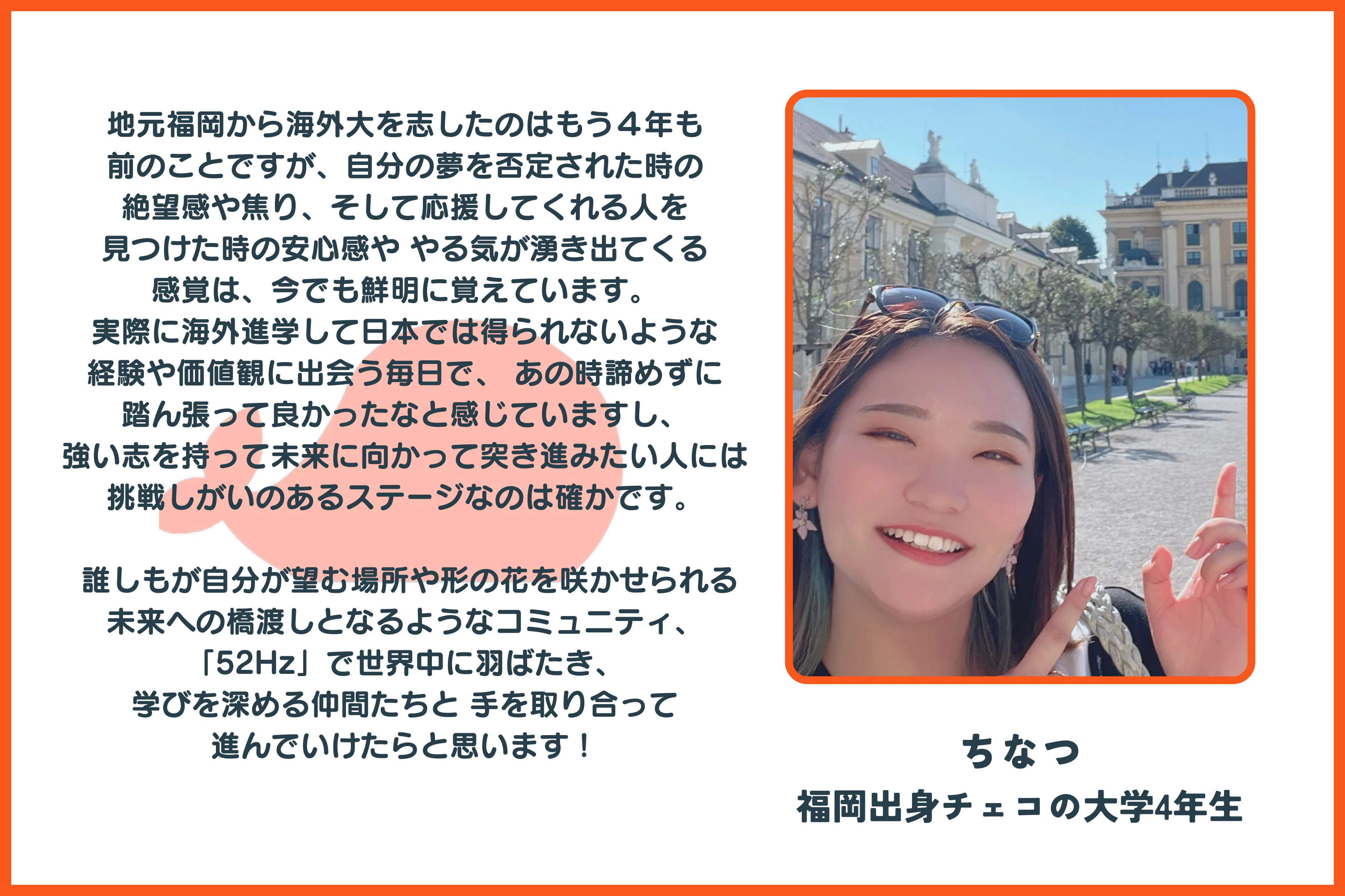 全国各地から既存の価値観に囚われない、個性豊かなチャレンジャーたちが集まるオンラインコミュニティ『52Hz』。私たちは、どのような環境でもグローバルな進路選択が可能な日本を目指して、全国で様々な逆境に向き合いながら海外大学への進学を志す中高生の支援活動を行っています。