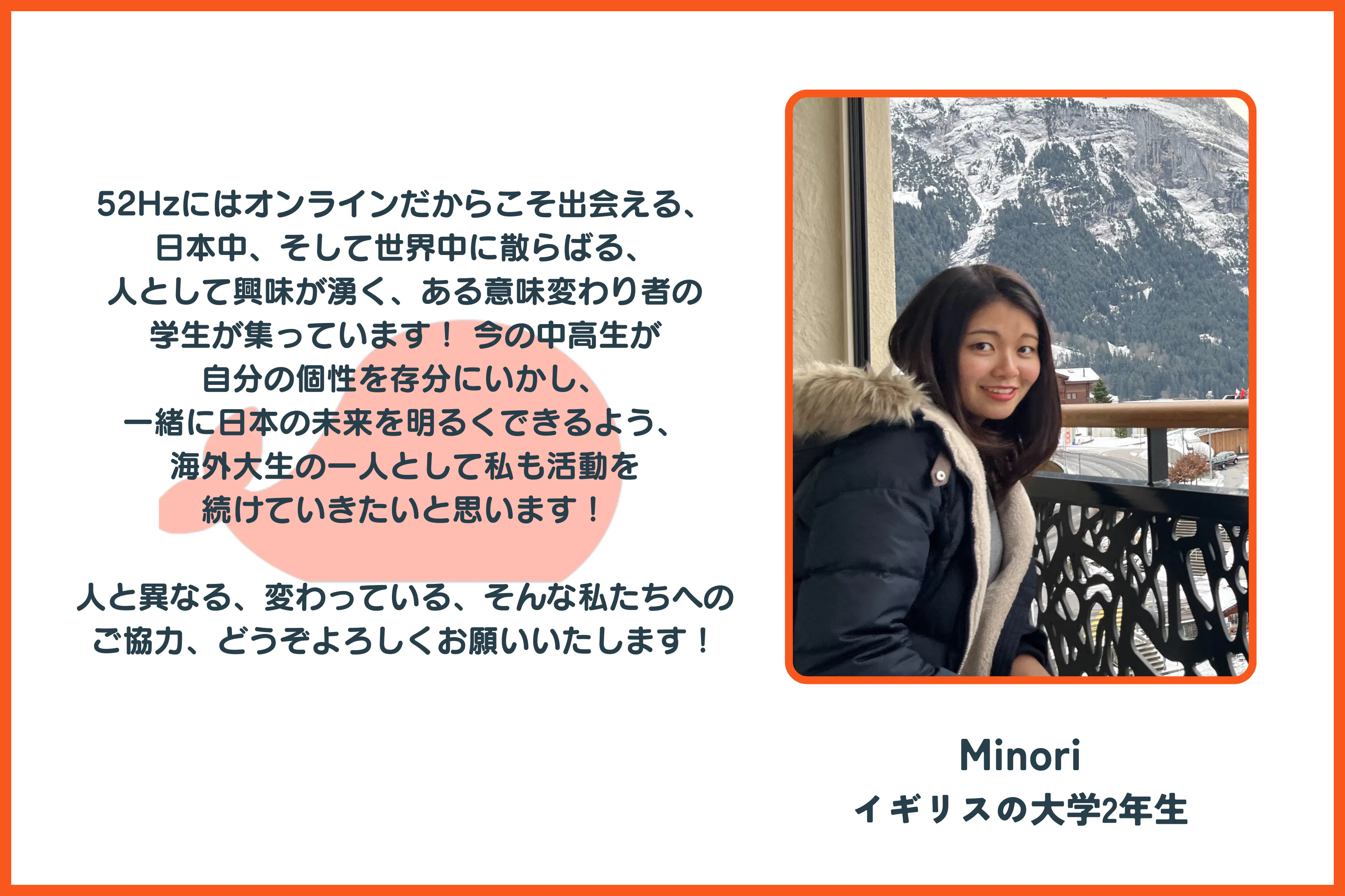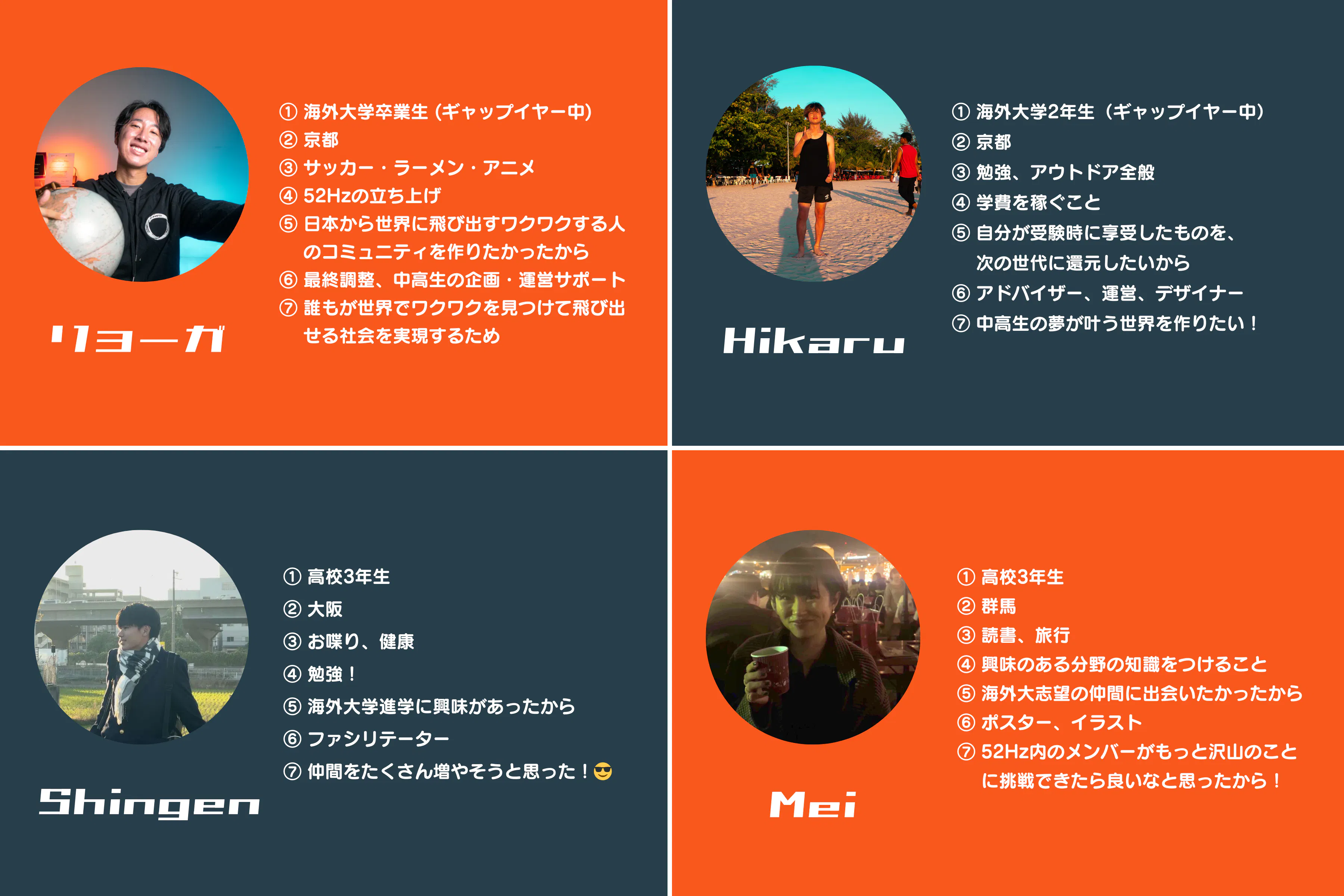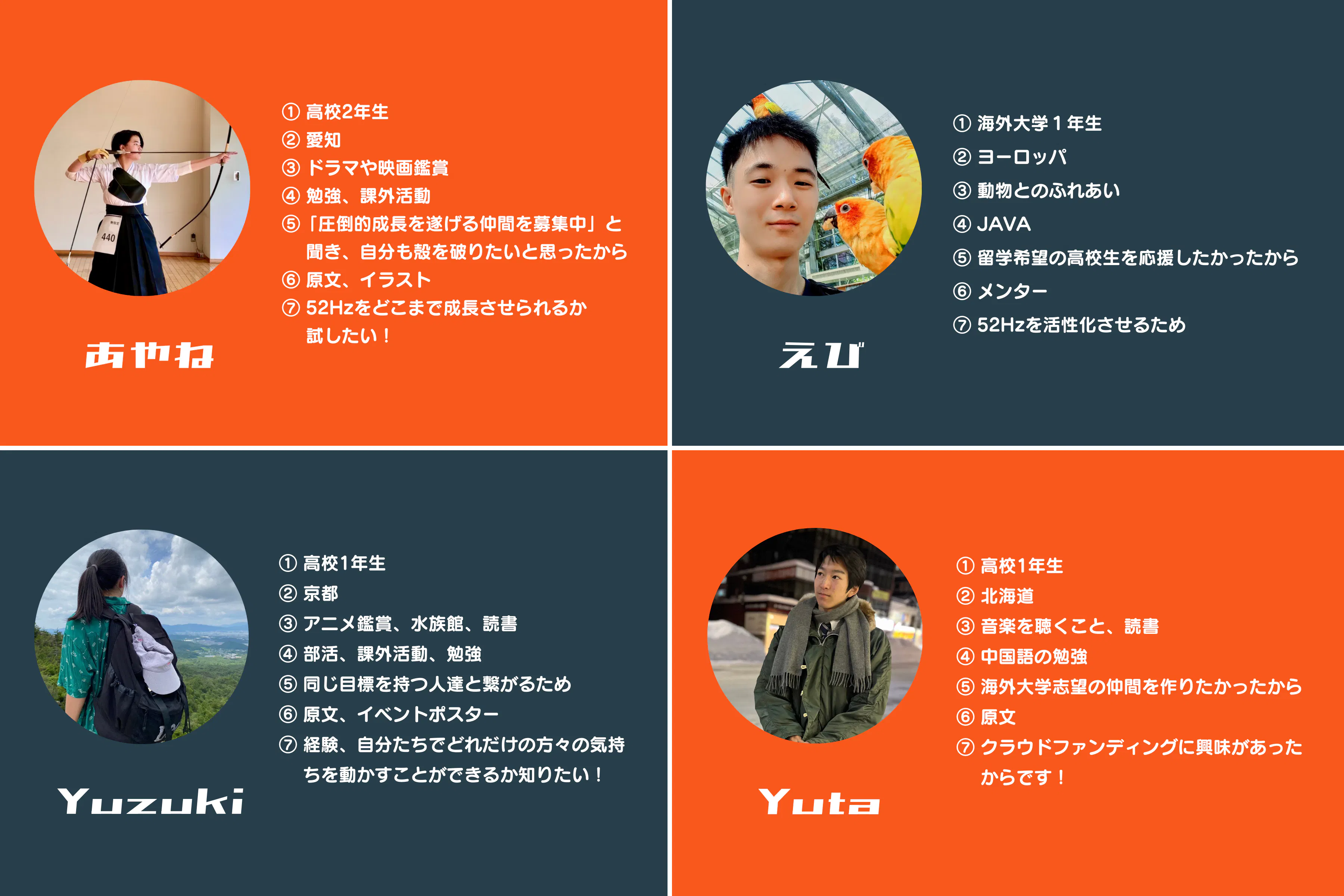 前のセクションで説明されているように、52Hzは現在、日本全国で海外大学進学を志す少数派の中高生のコミュニティ形成、探求支援をメインに活動しています。
