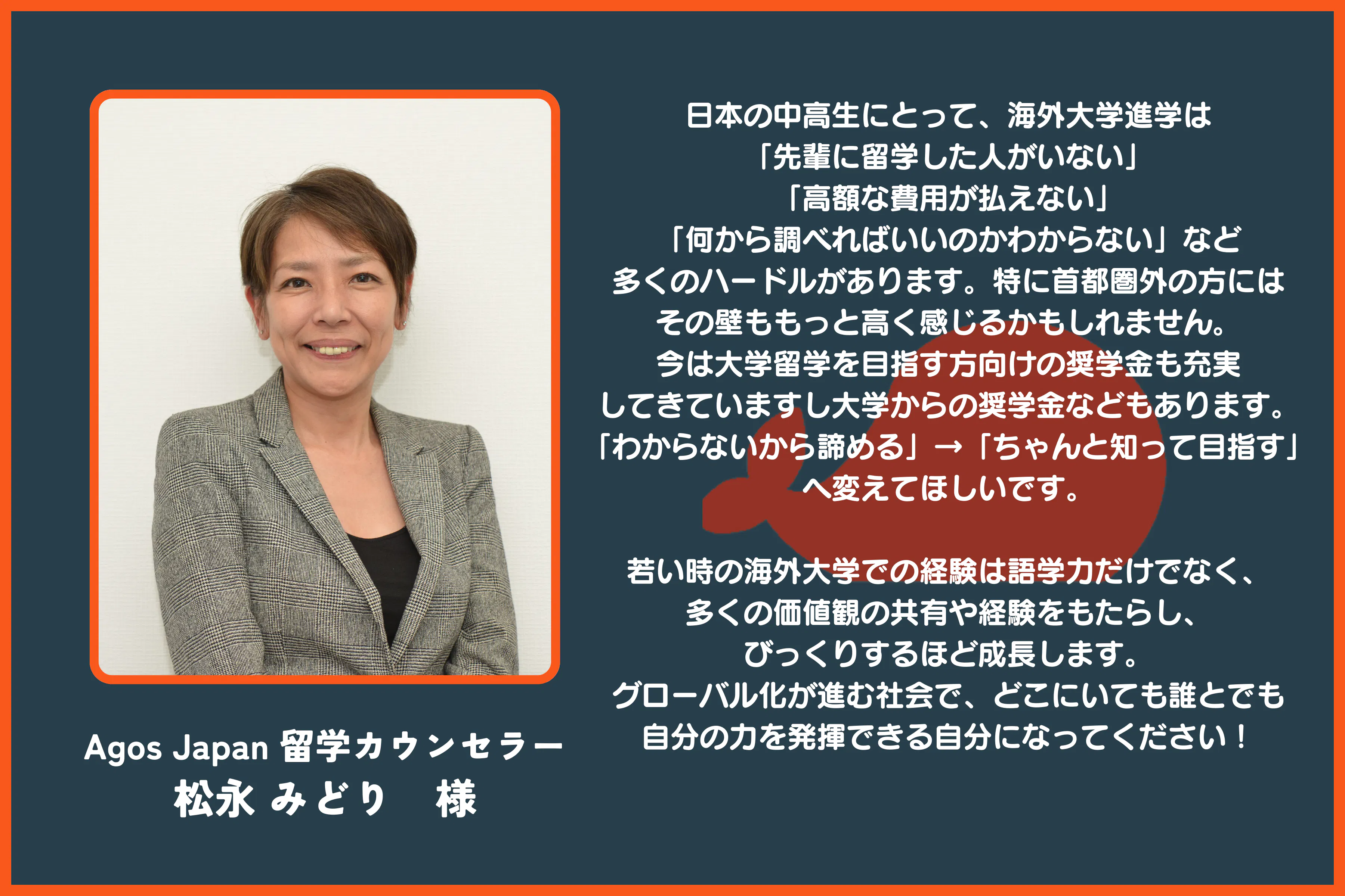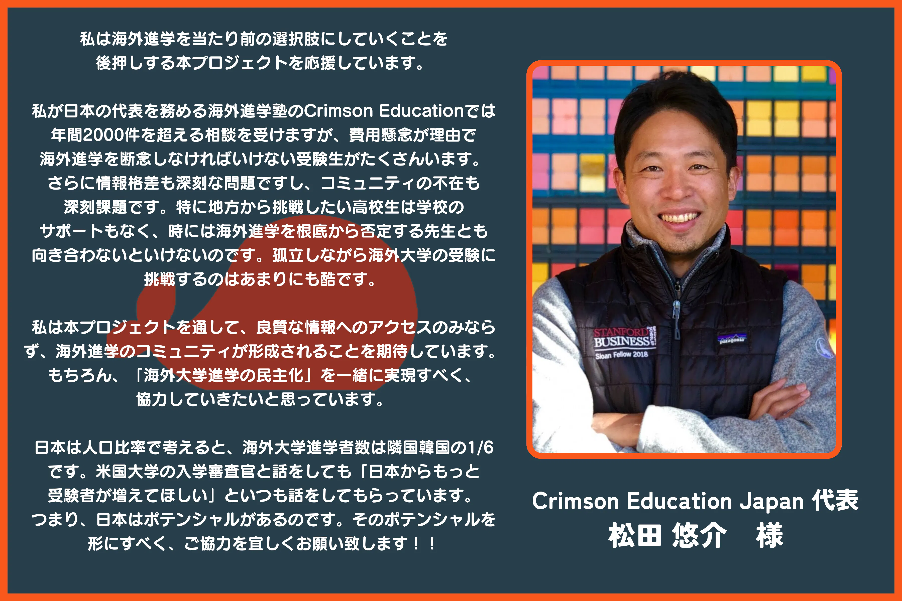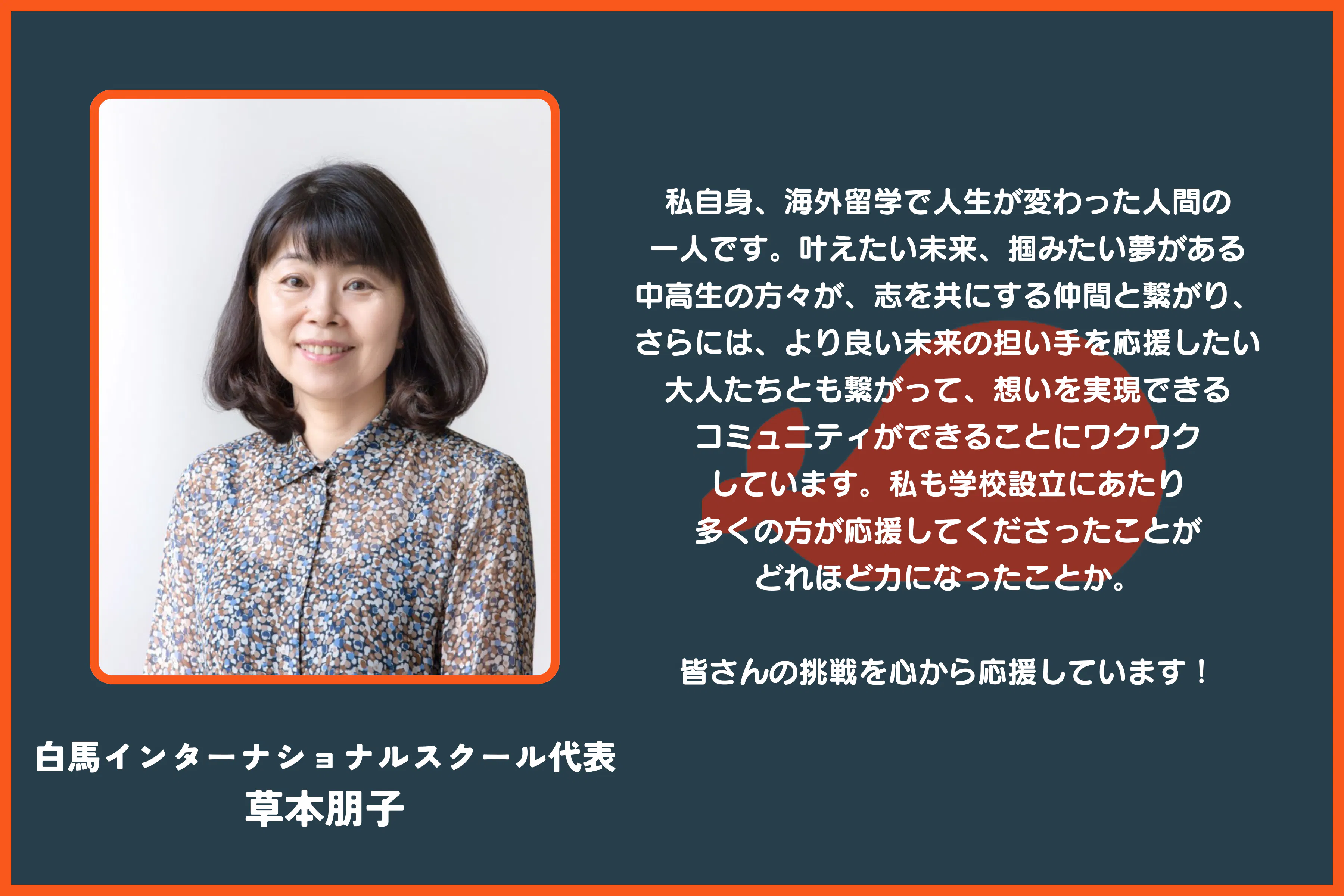 まだまだメジャーな選択肢ではない海外大学進学。時に反対を受けながらも、「学びへの強い想い」を持って進む中高生が最適な環境で学習し、その学びを日本や世界へ還元していく。このような社会を実現させるために、皆様のご協力、よろしくお願いいたします。