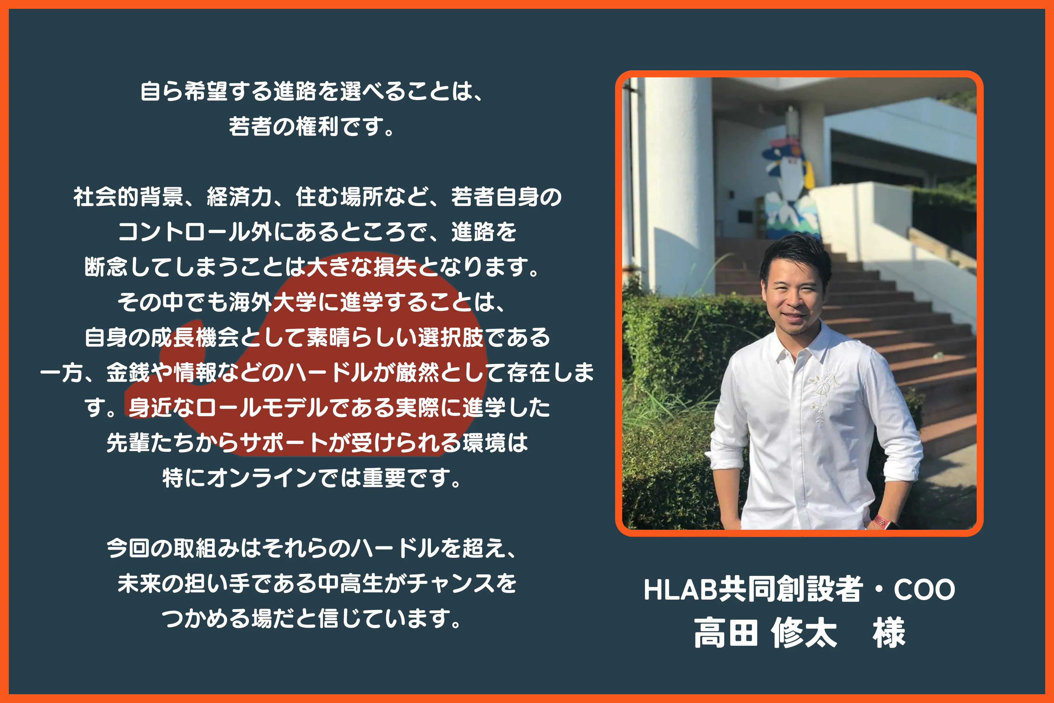 皆さんと全く新しい海外進学支援コミュニティをデザインしていけることを楽しみにしています!!