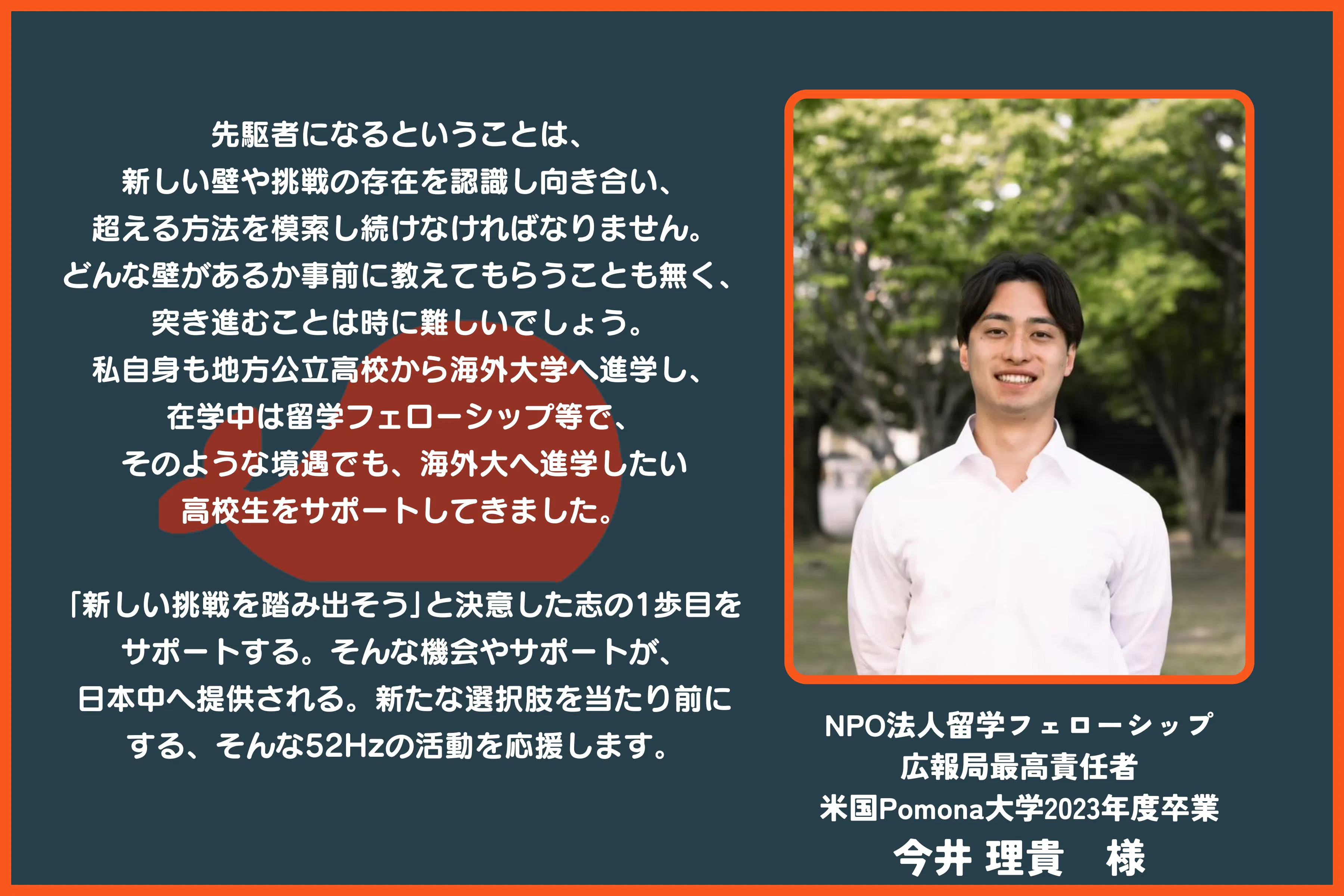 また、日本での海外大学進学を民主化することは、52Hzが目指す理想の社会実現のためのマイルストーンでもあります。海外大学進学をキーワードに、「知らないからできない・やりたいけどできない」という機会格差是正に取り組むプロセスの中で、誰もが環境に縛られずに自分がワクワクする世界へと挑戦できる社会システム構築を目指します。