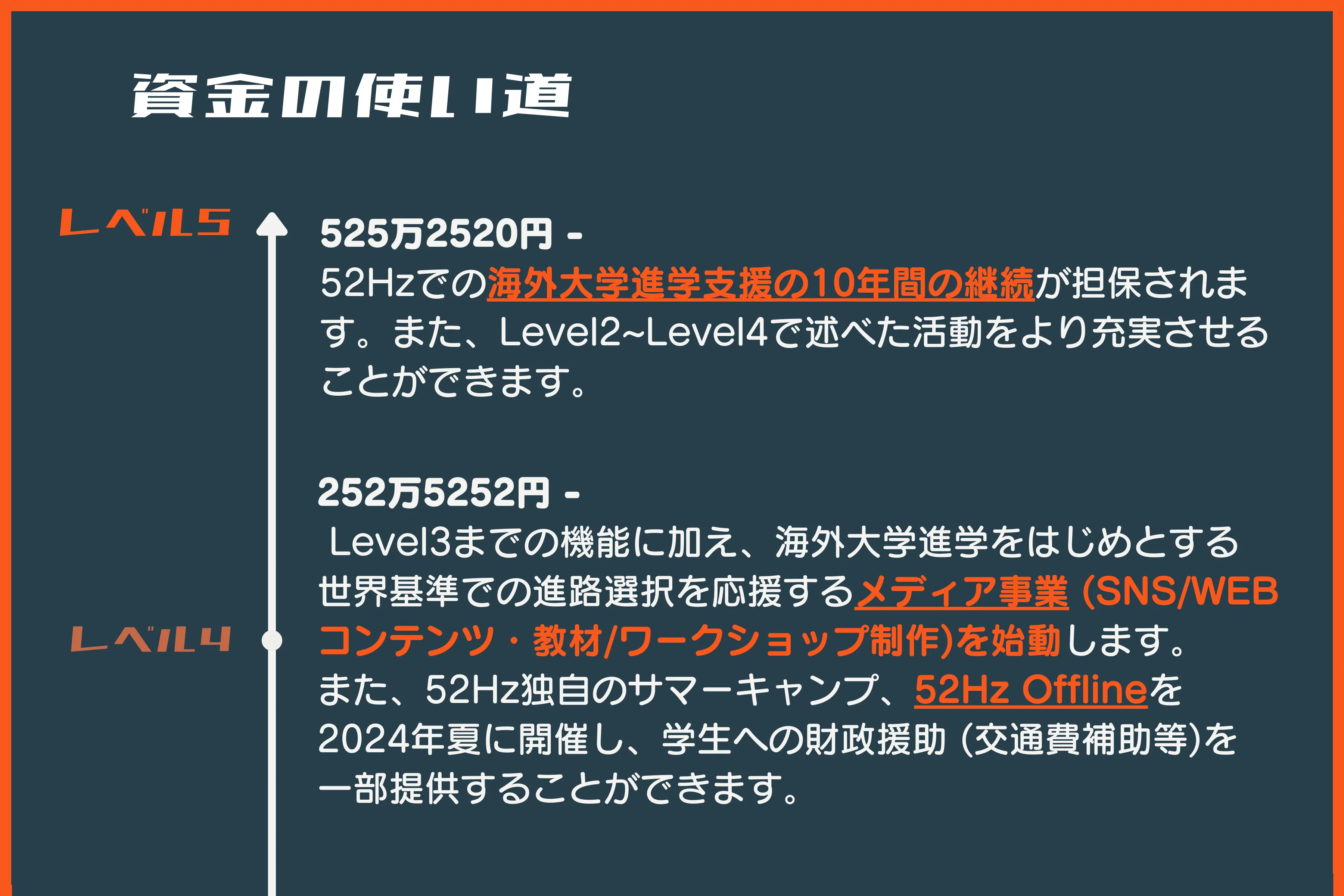 このクラウドファンディングでは、最低調達目標の52万5252円をスタートに、ステップアップ型での資金調達を実施します。最終到達額によって、今後52Hzで展開する活動の内容・スケールがレベルアップしていきますので、ぜひ皆さんの2カ月間に渡る応援をよろしくお願いします。
