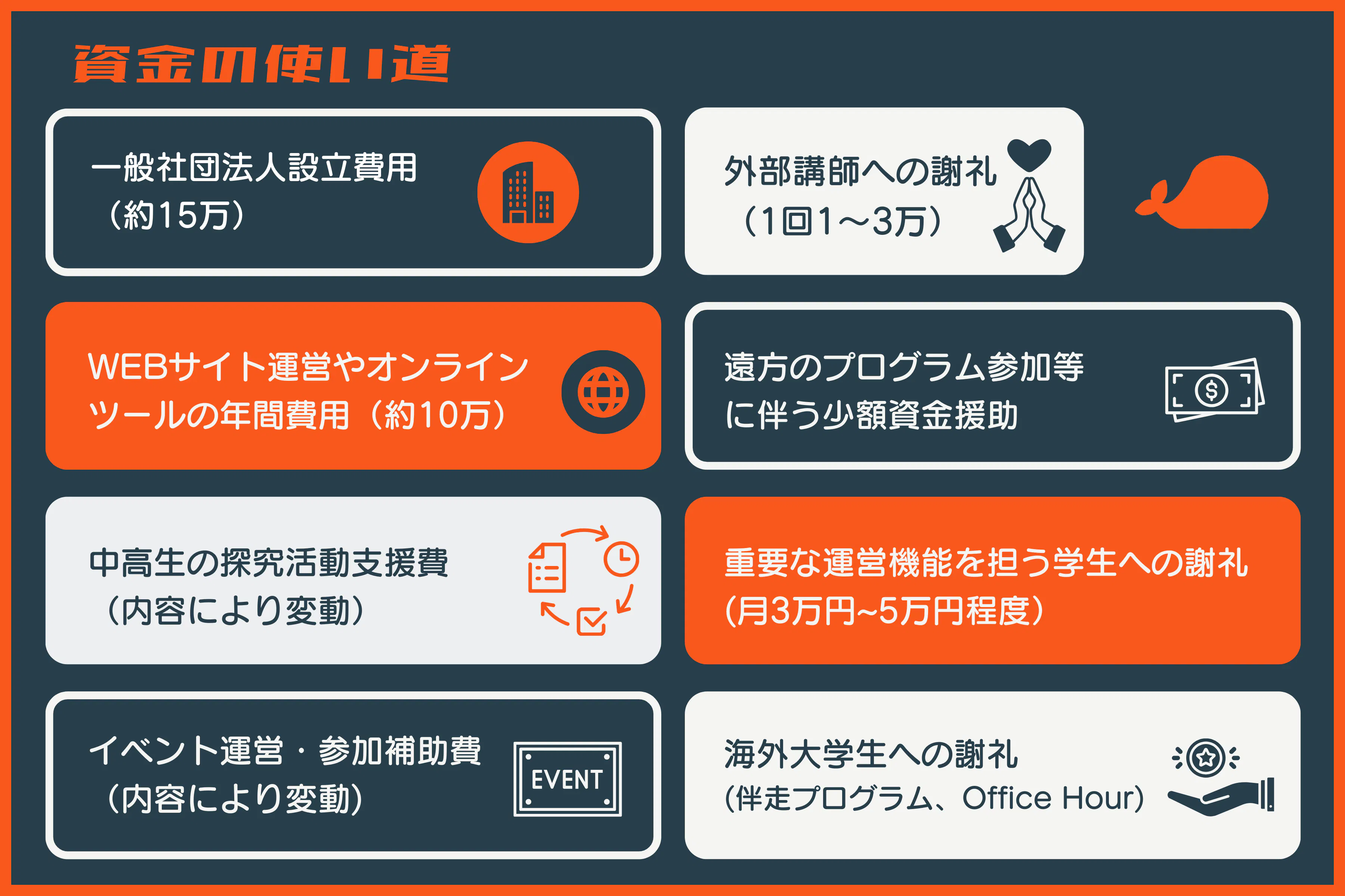 中長期的にこれらの活動を続けながら中高生の視野の拡大や自己探求をサポートすることは、彼らの目標達成・自己実現のために必要不可欠です。ですが、サマーキャンプを行うための会場費や金銭的に厳しい中高生の交通費の補助、講演の依頼などコミュニティ内外に直接的な支援を行うためにも莫大な額が必要となることが予測されます。