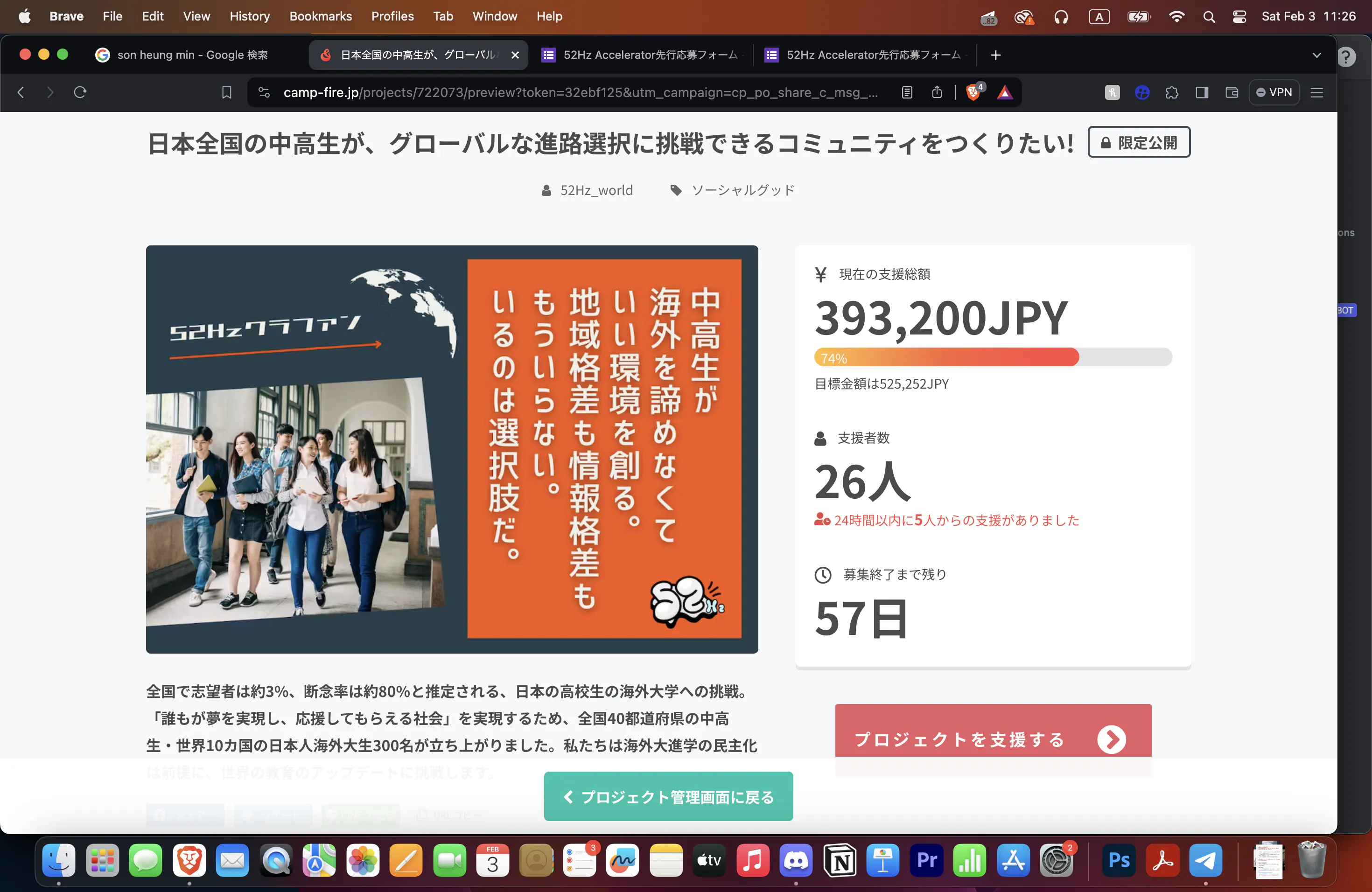 ぜひ皆様の熱い応援とパワーを原動力に、この土日で最低調達目標100%の52万5252円を超えられるように勝負をかけたいと思っています!!