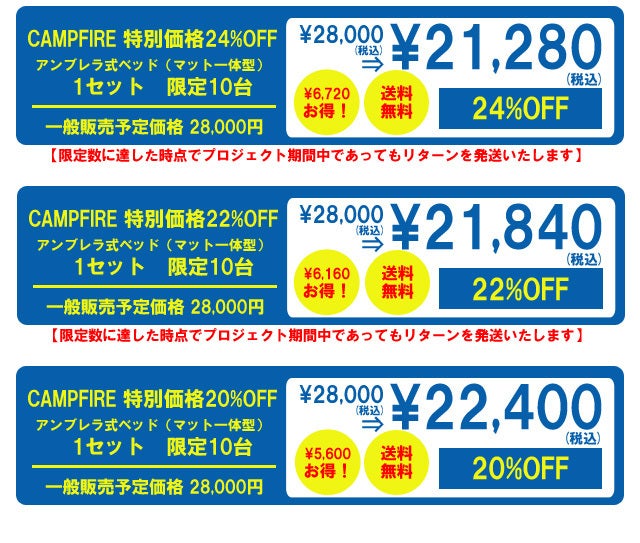A:アンブレラ式ベッドマット一体型の一般販売につきましては、CAMPFIREからお申込み頂きました方へのリターン納品完了後に実施をする予定にしております。特別価格にてご入手いただけるこの機会に是非ご支援下さい。