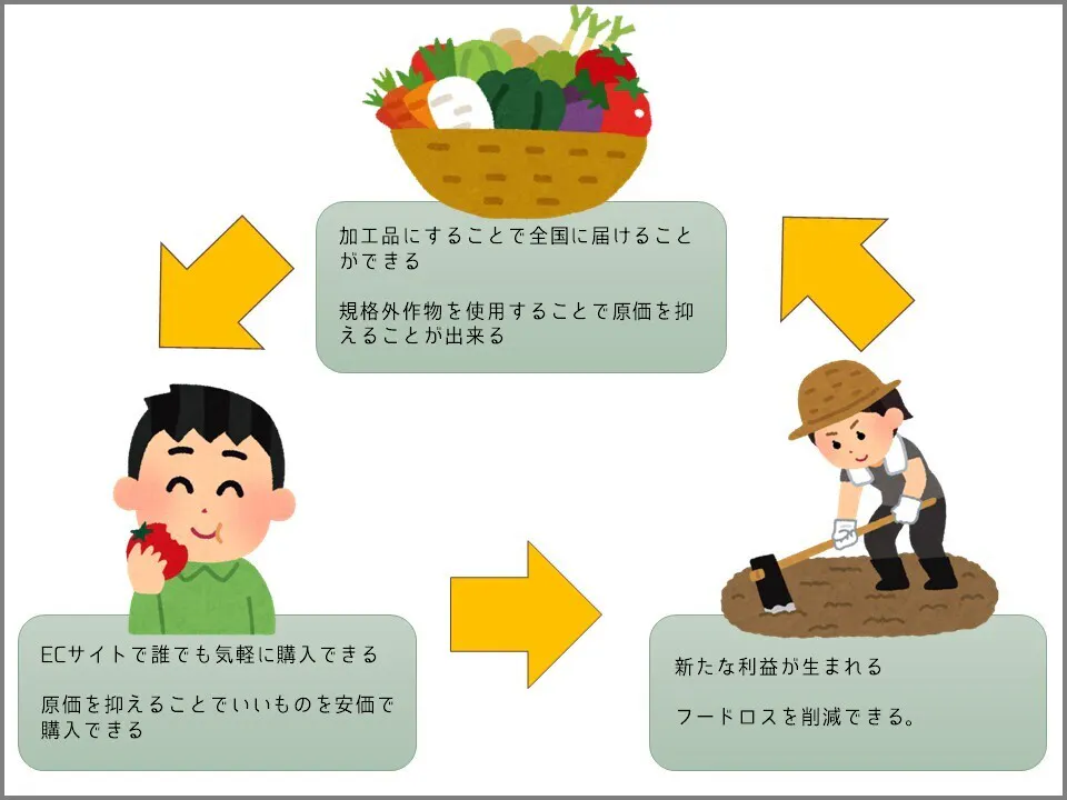 サービスの質には提供する側のパフォーマンスの向上は欠かせません。地域住民の生きがいにつながる新たな刺激と適正な収入はよりよいサービスの提供を可能にします。また高いサービスの質が維持できれば、顧客満足度は上がりリピート利用や口コミ増加に繋がります。フードロス対策も兼ねており、地域だけでなく全国の農家が抱える課題にも取り組むことで社会貢献に繋がると考えます。