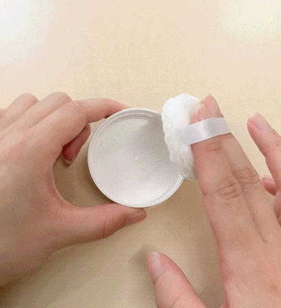 ①外蓋(キャップ)にパウダーを適量出し、パフを押し当て、しっかりと含ませます。