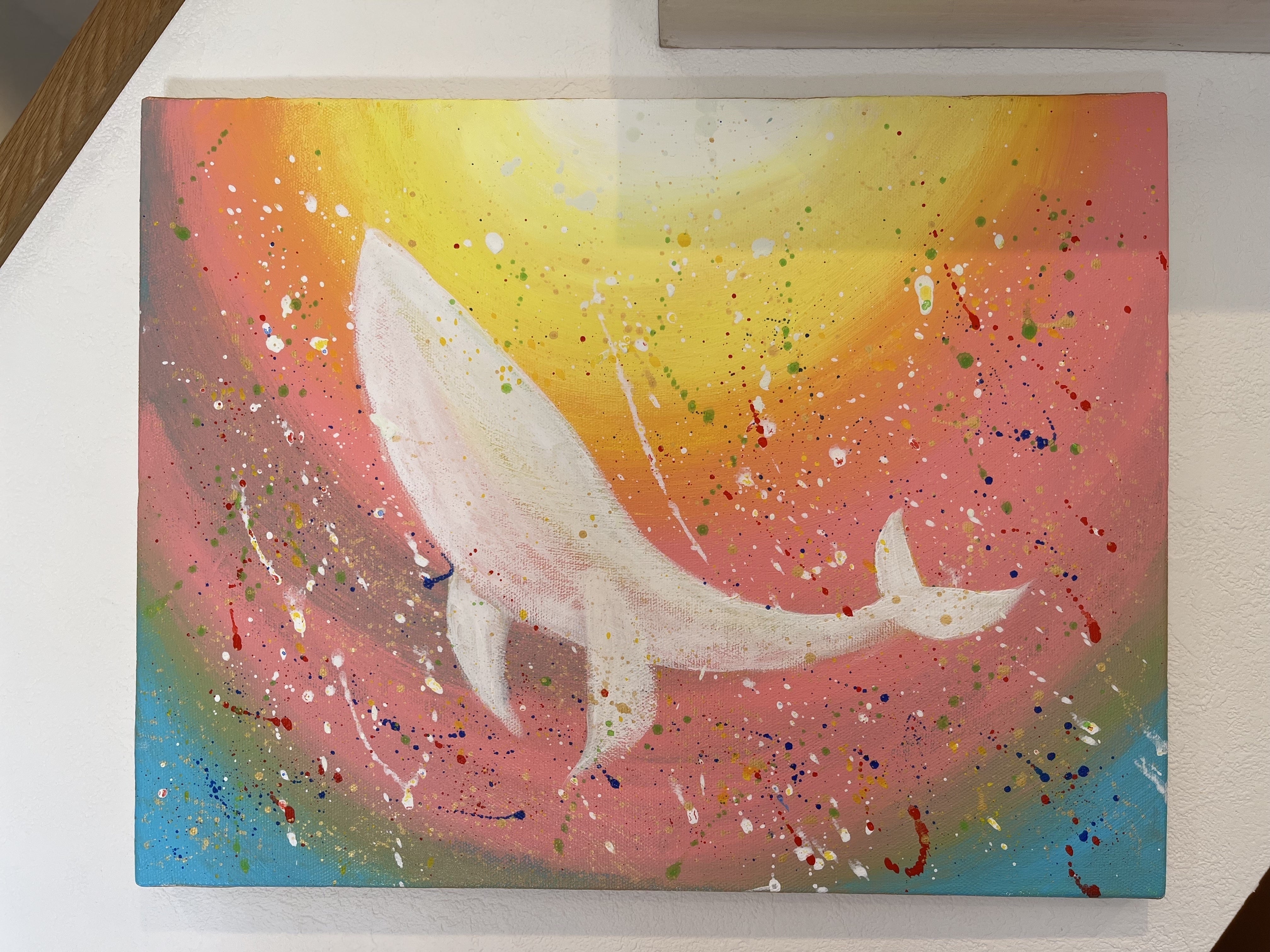 会社員を続けていくべきか、それとも自分のやりたい方向に大きく舵を切った方がいいか悩んでいた時、すみちぇるのチャネリングアートを体験しました。「あやのんさんからは、やさしさ、柔らかさ、愛を感じます!モチーフはクジラです」と言いながら表現してくれたのが上記の写真の絵です。