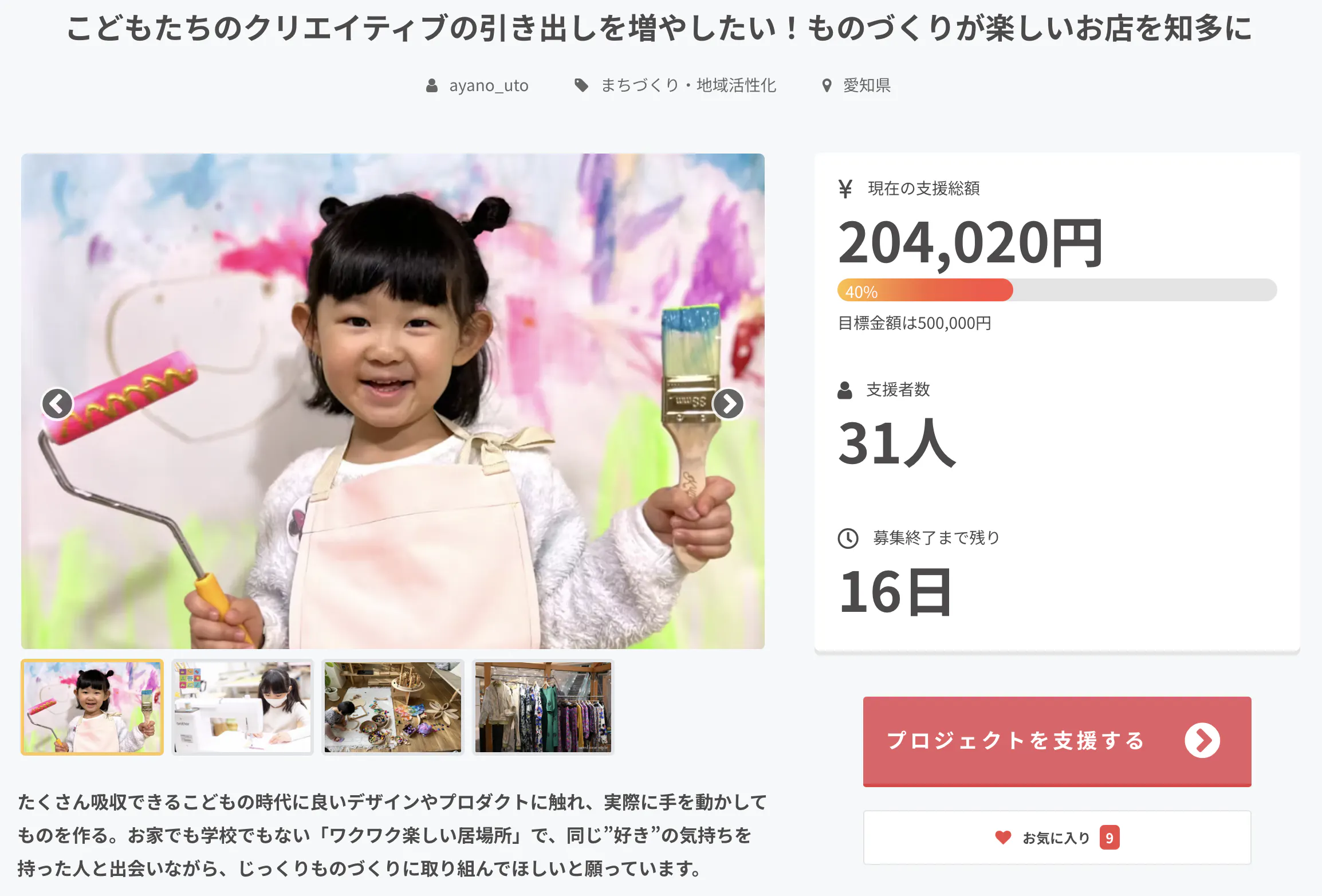表題の通り、支援総額が目標の40%である20万円を超えました。