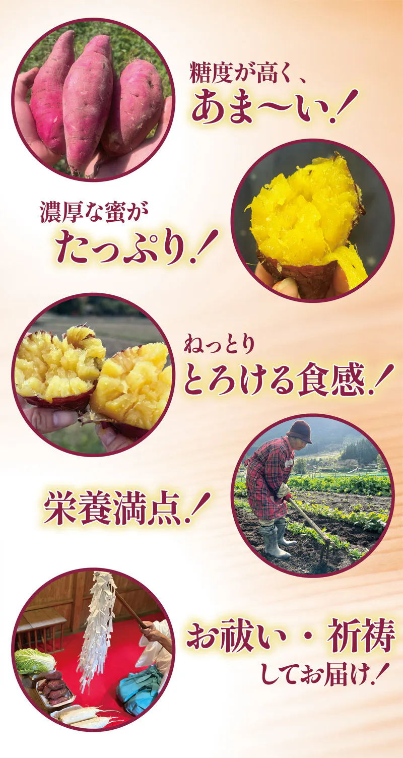 糖度が高いと有名な『紅はるか』をさらにあま〜く、こぼれ落ちるほどたっぷりな蜜入りした『乙女の鈴なり』をぜひご堪能ください。