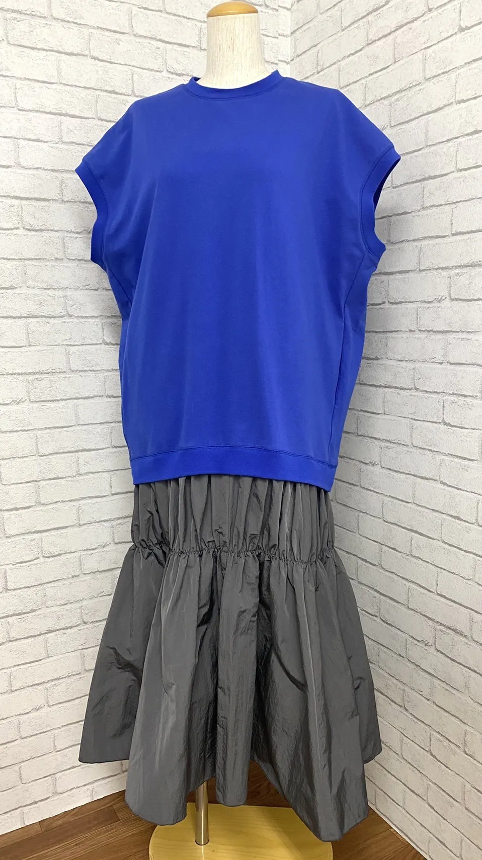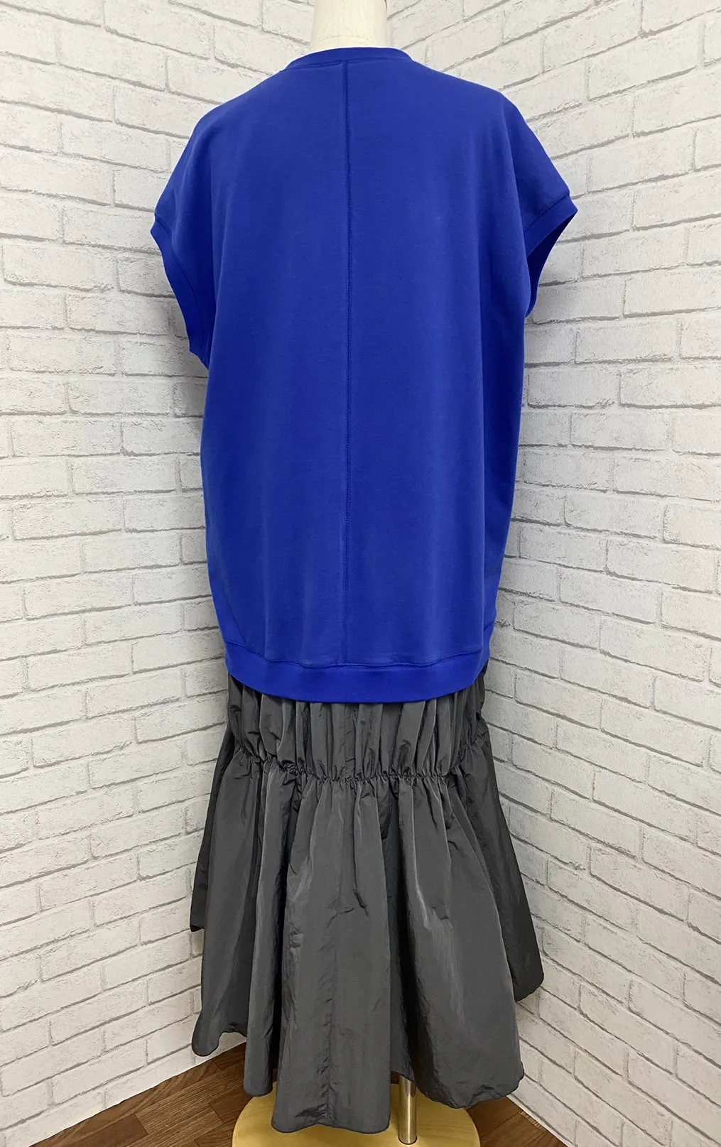 ・カットソーとハリのある布帛(ふはく)を組み合わせたドッキングワンピース