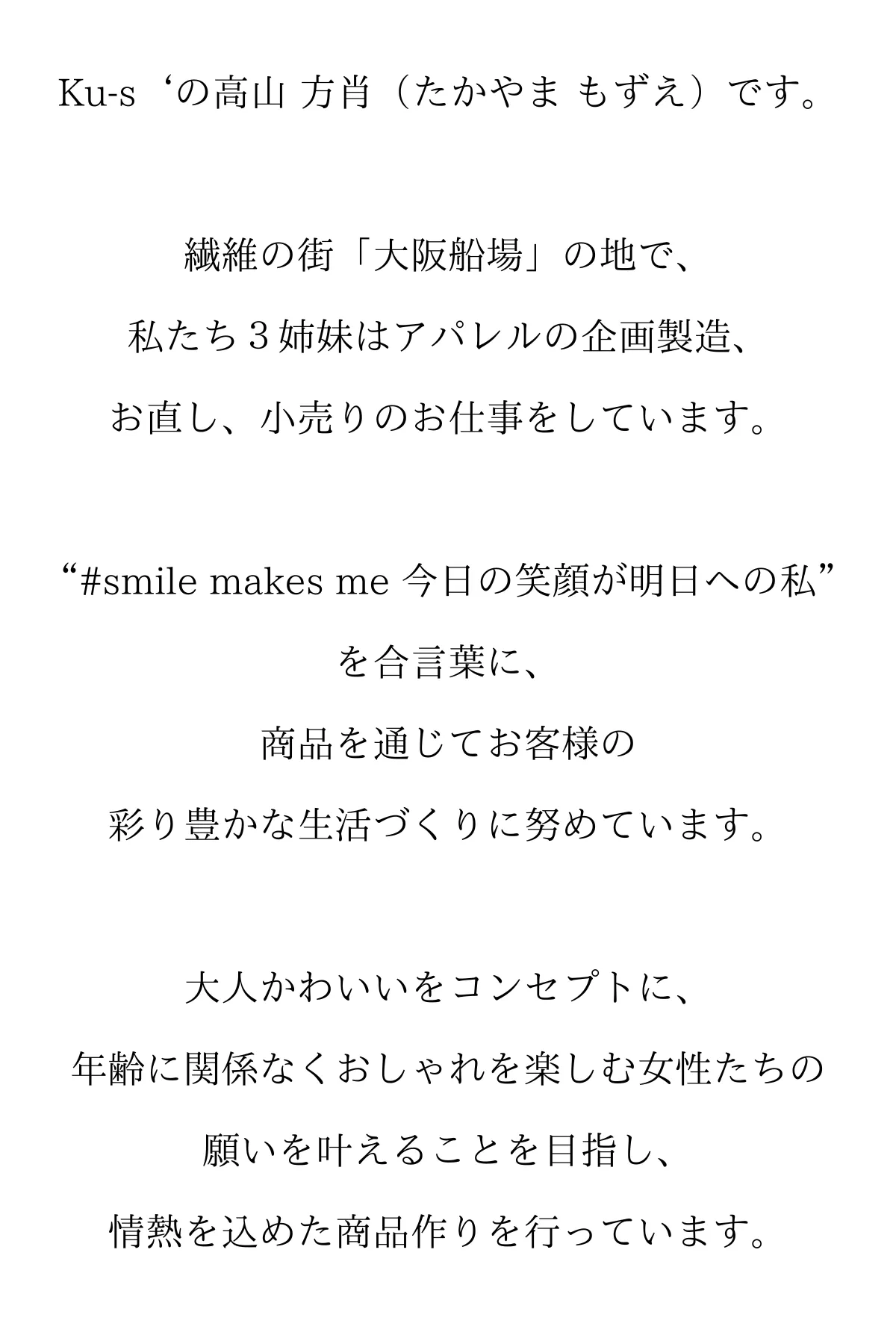 いつまでも色あせない長く着続けられるデザイン、心の通った接客を大事にするブランドを作り上げていきます。