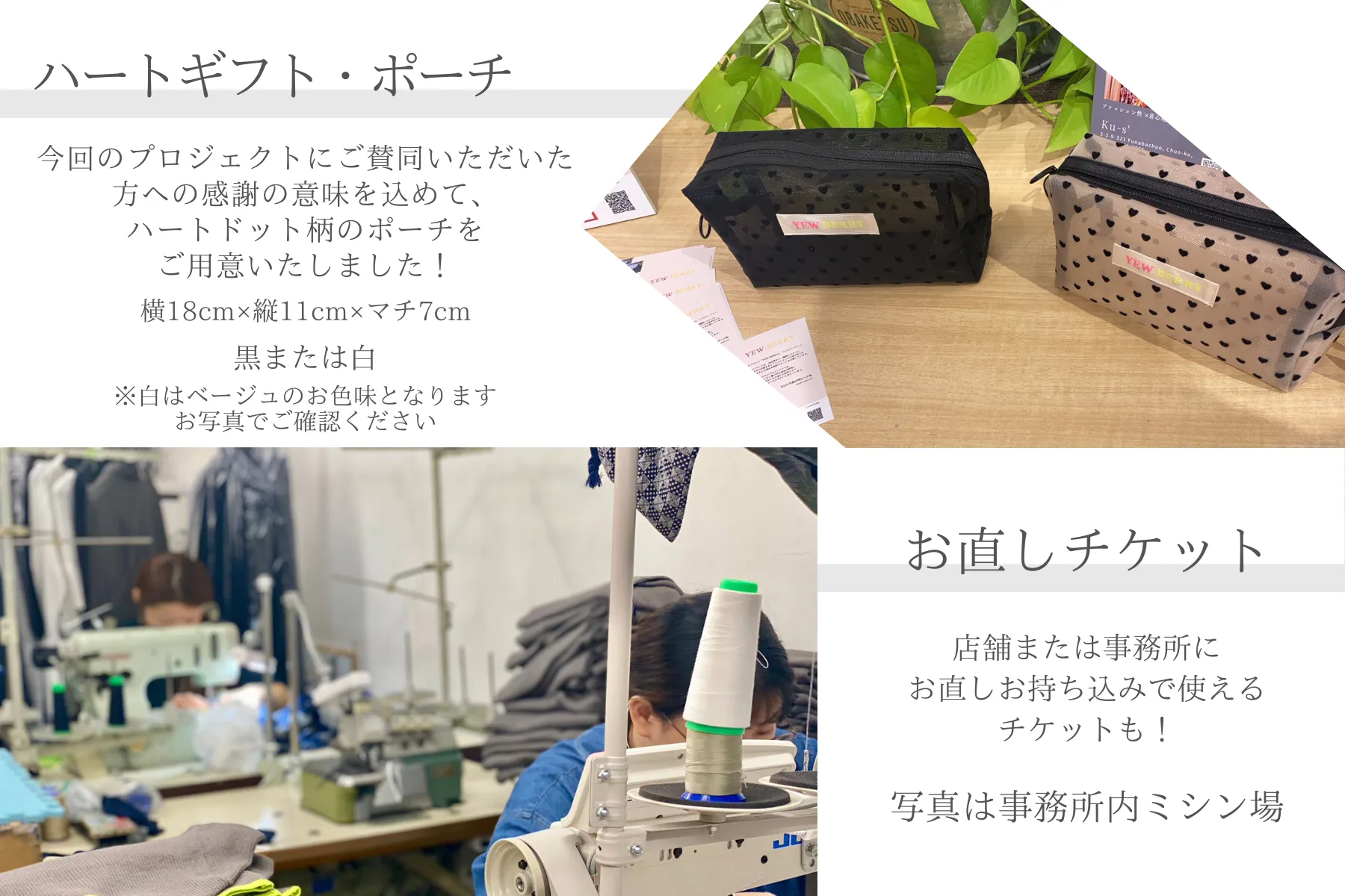 洋服のリターンに加えて、ポーチやお直しに使えるチケット、オリジナルワンピースの企画・制作など、さまざまなリターンを用意させていただいております。