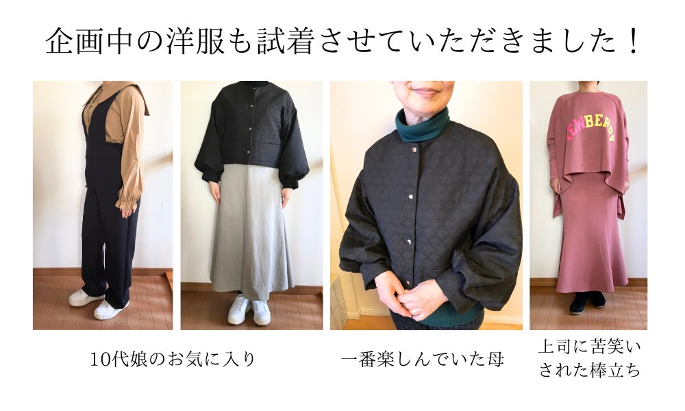 今回サンプルで試着した服以外にも、手持ちの服とも合わせやすく普段使いからフォーマルまで着られそうで製品が楽しみです。