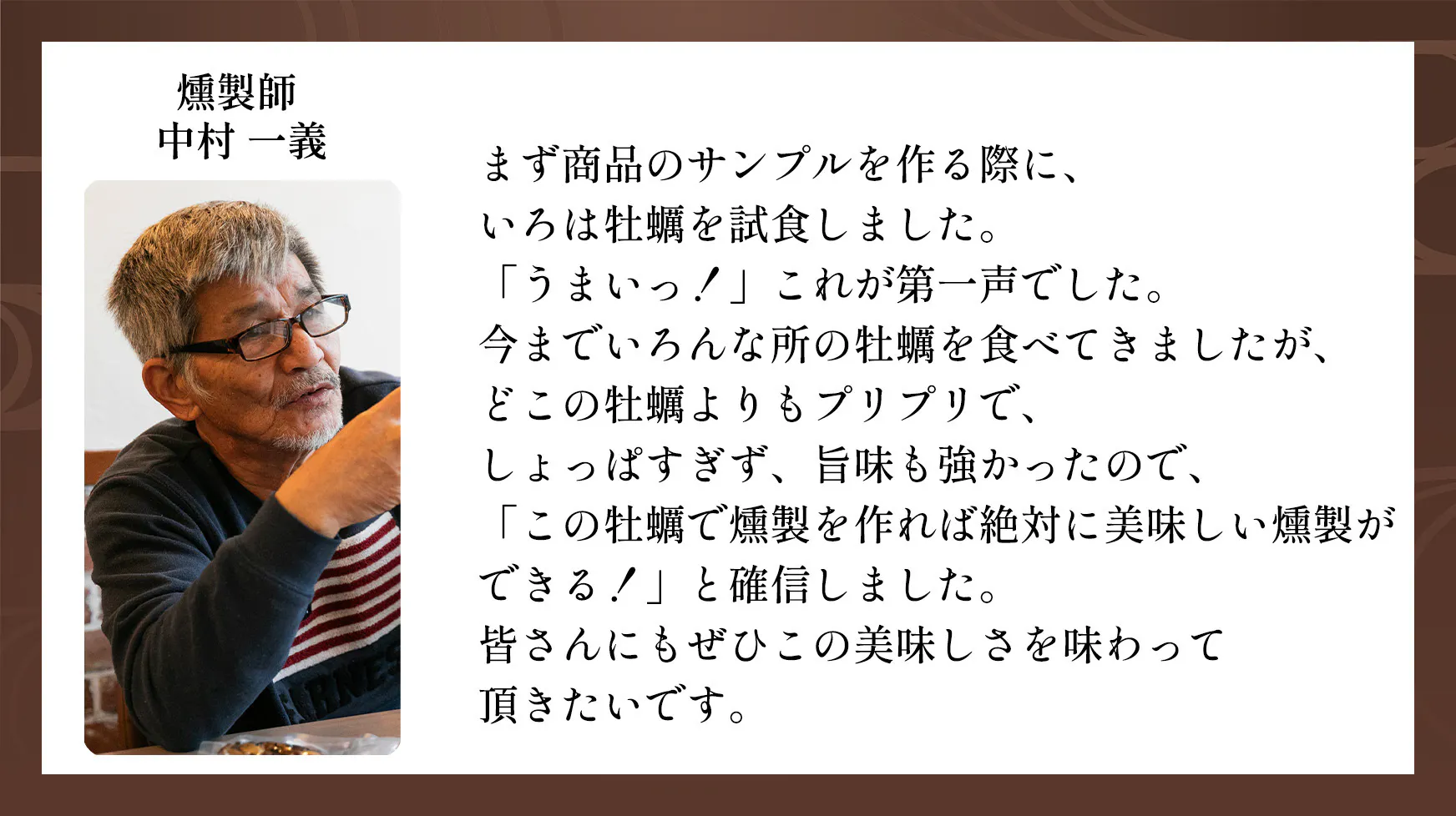 相談していた食品加工会社の工場長から燻製職人の中村さんをご紹介いただきました。