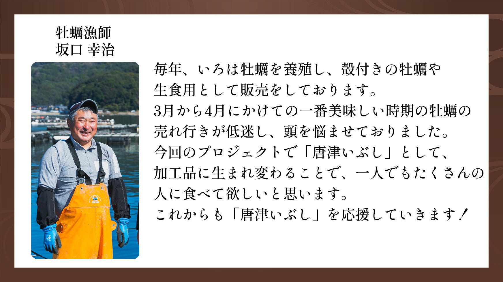 今回は故郷、佐賀県唐津産の美味しい牡蠣をもっと知って頂き、全国の皆様に食べて頂くことで