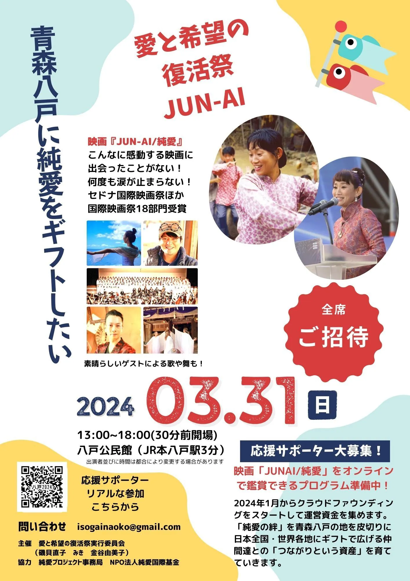 青森県八戸市で3月31日に、映画「JUNAI/純愛」仲間(みき・金谷由美子)と一緒に、映画「JUN-AI/純愛」の上映を中心としたイベント『愛と希望の復活祭 JUN-AI 』を開催します。全席500席ご招待のイベントです。