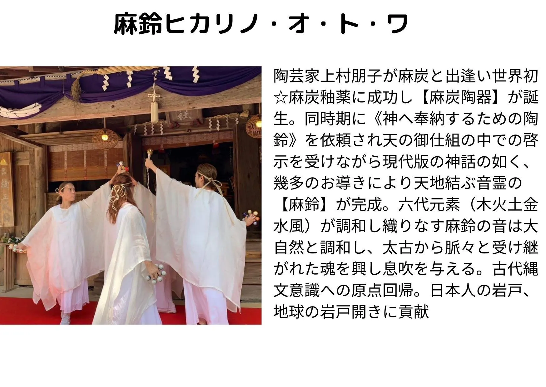 映画の中では、ひとりの日本人女性が、正直に内なる純粋意識で生き続けることで、悲しみや憎しみに満ちた周囲の人々の意識を変え、結果として村全体を大きく変えてしまう様子が描かれています。