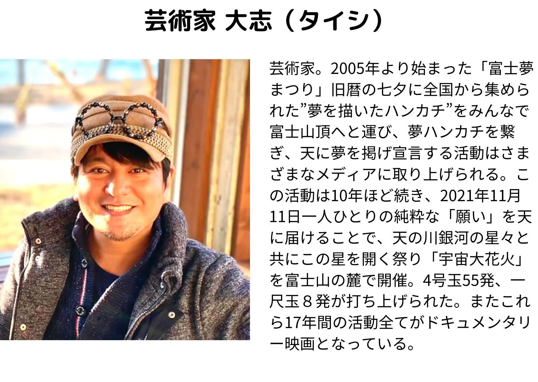 ※プロジェクトの成立後、天災などやむを得ない事情(緊急事態宣言などコロナウイルスによる影響を含む)によりイベントが開催できなかった場合、延期あるいは場所を変えて開催する予定です。
