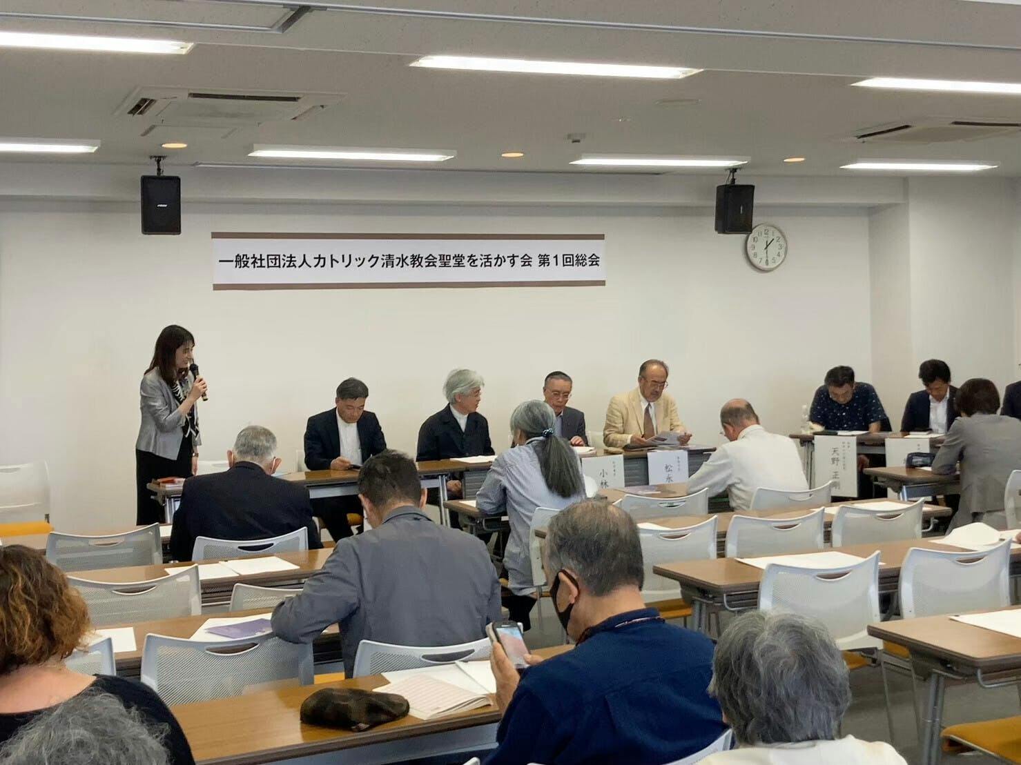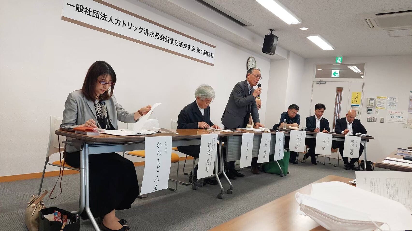 私たちは、2014年からの活動の末、2023年5月27日に「一般社団法人 旧カトリック清水教会聖堂の木造ゴシック建築を活かす会(前:カトリック清水教会聖堂を活かす会)」を発足しました。一級建築士の塩見寛氏を理事長におき、その他建築士や地域プロデューサー、ステンドグラス作家などが参画して一丸となり、希少な木造ゴシック建築が解体され歴史から姿を消してしまう運命から、新天地での復活再生に向け新たな道を歩み始めました。