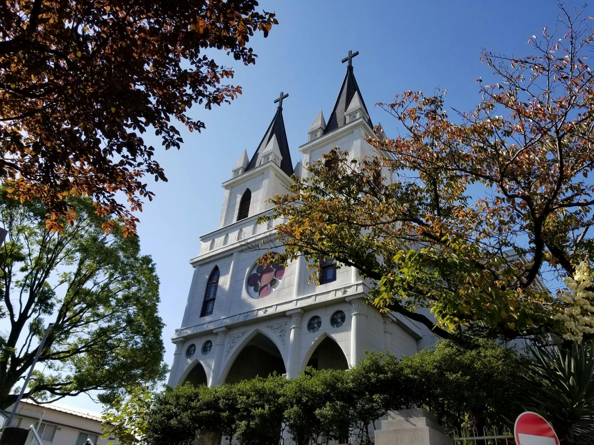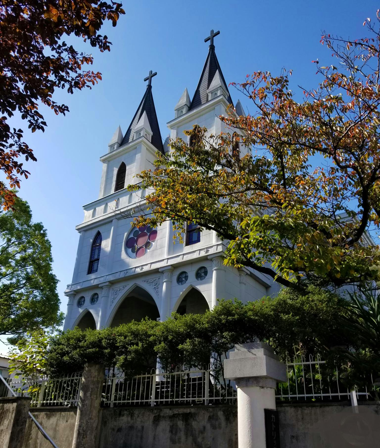 清水港へと続くなだらかな坂道の途中に、日本では珍しい二つの尖塔を持つ教会があります。