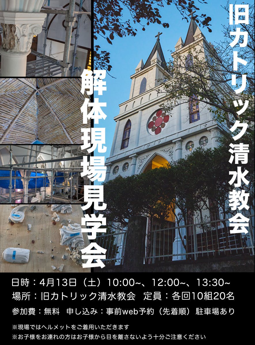 解体直前には地域の皆さんを中心に、県外からも多くの方に足を運んでいただき、旧カトリック清水教会聖堂の最後の姿を見ていただきました。そして、2023年末より解体作業が始まり、新たな場所での再建に向けて構想も進んでいます。
