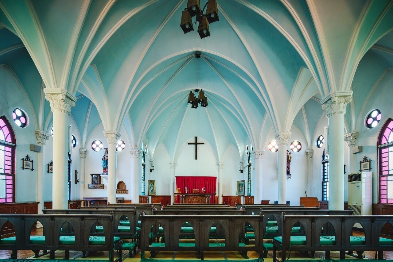 旧カトリック清水教会は、外観を双塔と窓のトンガリア-チ、それに8本の円柱で見事に飾っています。西洋では柱を美しくすることが建築を美しくすることでした。特に内部の柱身と柱頭そこから延びるリブヴォルトは見事です。