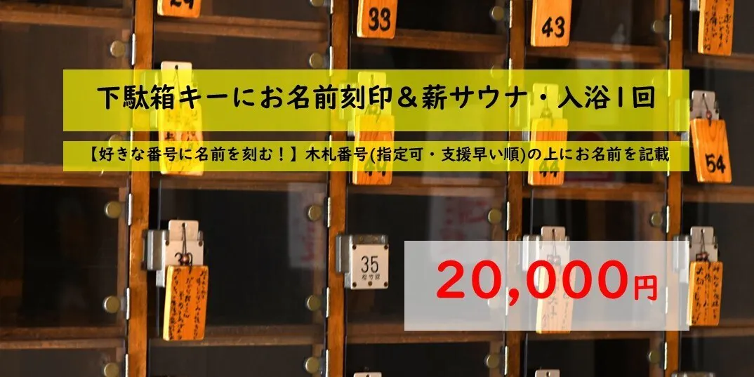 ■下駄箱キーにお名前刻印&薪サウナ・入浴1回:20,000円(限定20組・番号指定可)
