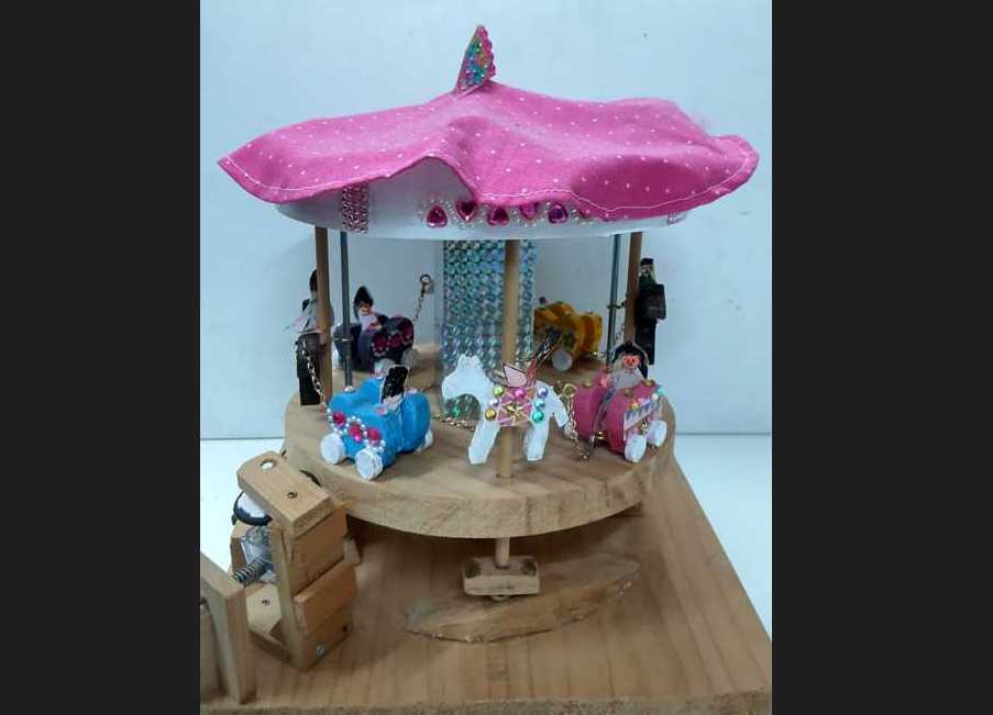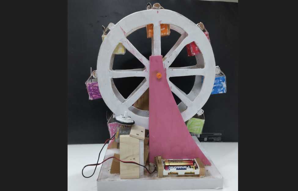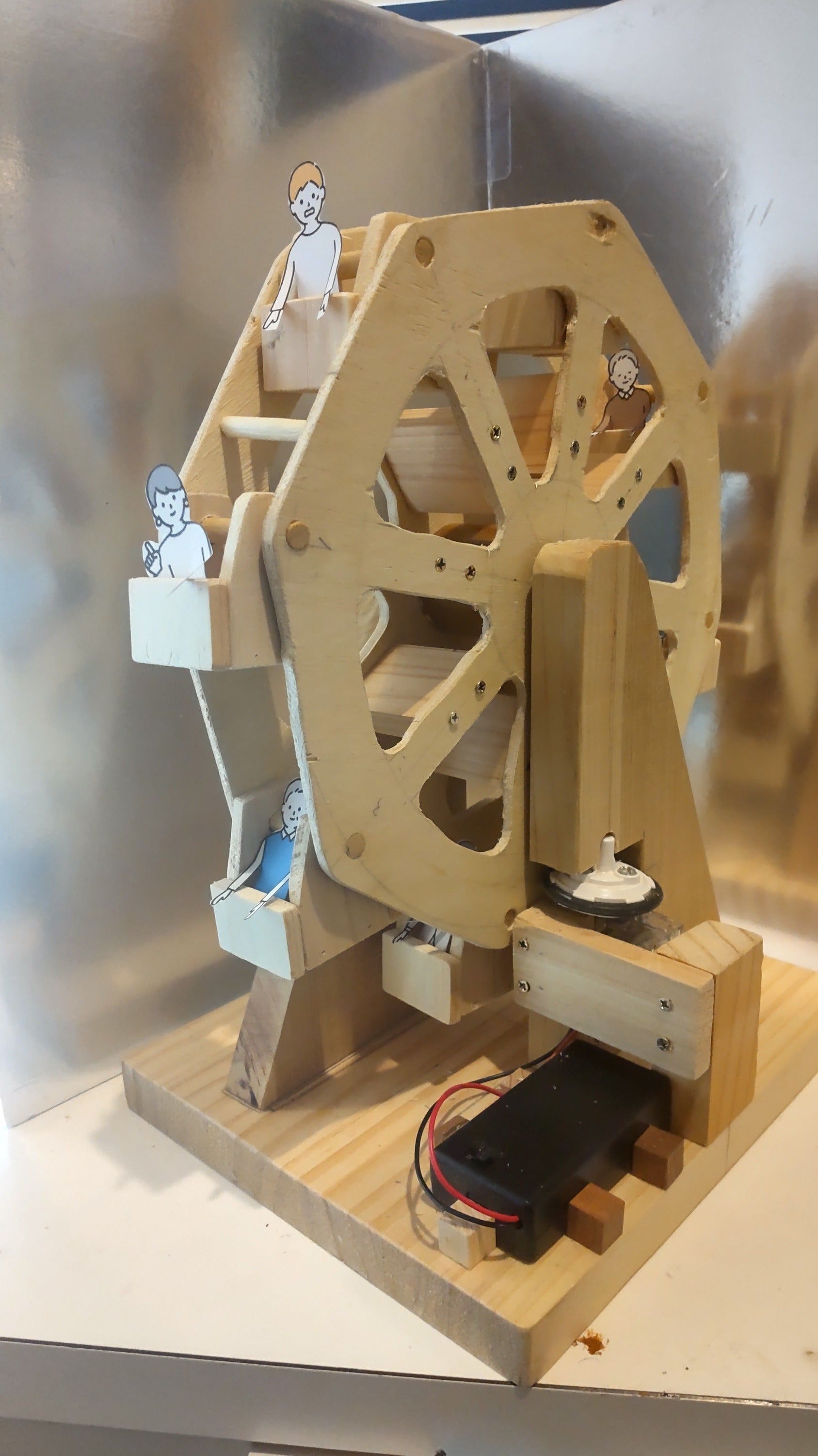 これはモータを使用した観覧車の試作品です。基本設計と製作を手伝い小学2年生の孫が完成させました。
