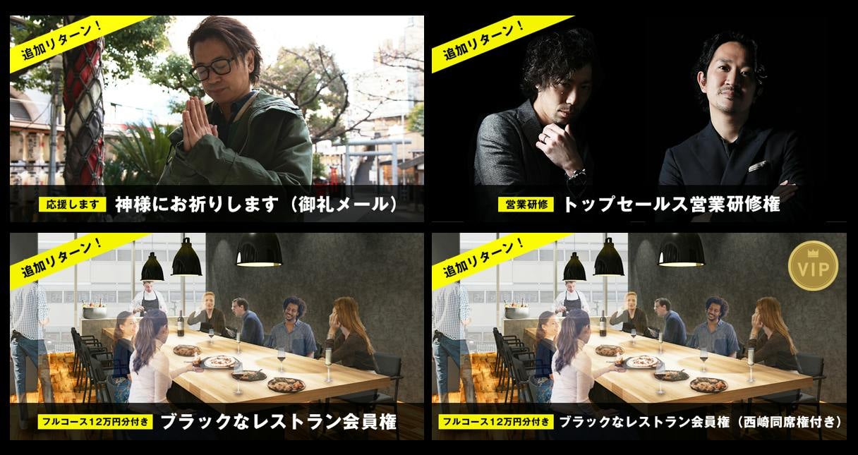 ブラックなレストラン会員権に、西崎同席での会食がセットになったリターンです。