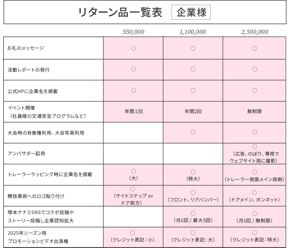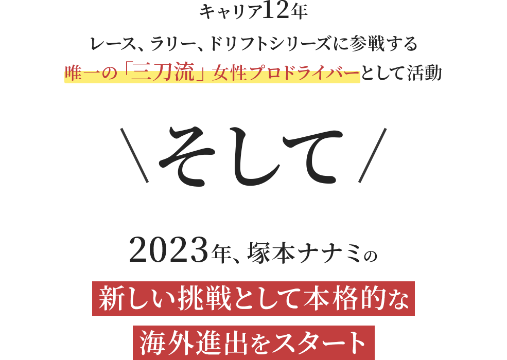 塚本ナナミの挑戦をご支援いただくことが、企業様にとっての利益に繋がるよう活動していきます。Formula Drift USAはアメリカをはじめ世界中で中継されていますので、今、アメリカ進出のきっかけを探している企業様にとって大きな認知拡大チャンスとなる可能性が高いです。塚本ナナミと一緒にアメリカ進出、そして成功への道のりを歩みませんか?