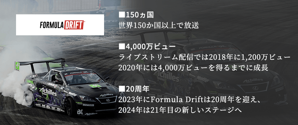 日本発祥のドリフトは今、世界の中で最も華麗で、見応えのあるモータースポーツ競技として認められ人気を博しており、アメリカ、ヨーロッパをはじめ、ロシア、タイ、インド、韓国、中国、ブラジルなどでも大人気となっています。