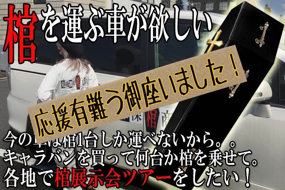 しかし!『イベントに来て欲しい!』『作品見たい!』と言う声も沢山頂けたので、今回の支援金を地方イベントへの遠征費と、今の車でももっと棺を積みやすくすべく!良い台車や折り畳み棚を作ったり等。棺をスムーズに積んでもっとイベントに行きやすく出来る材料の購入に使わせて頂きます!