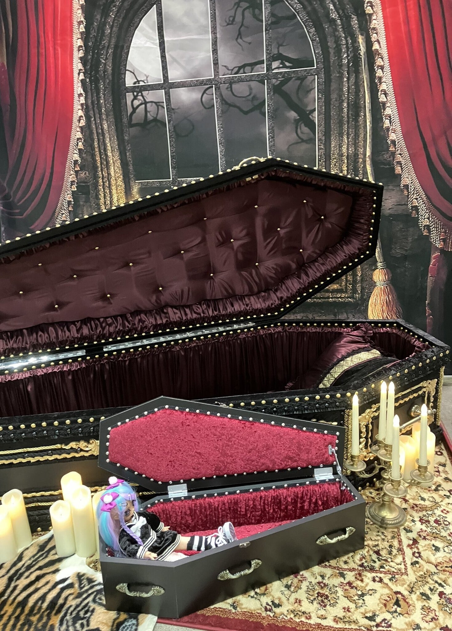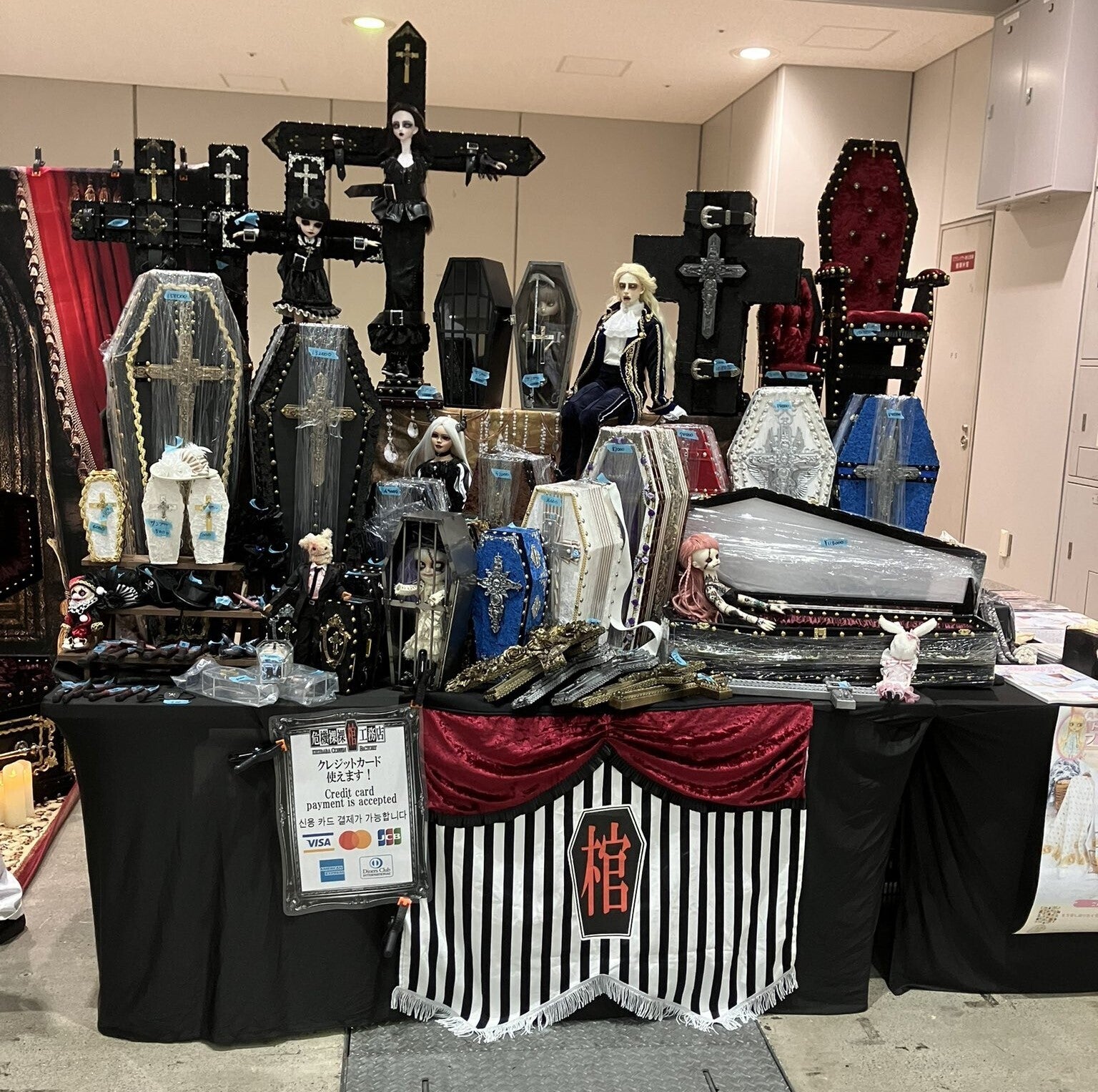 こんな感じで等身大棺の入棺コーナーあり!