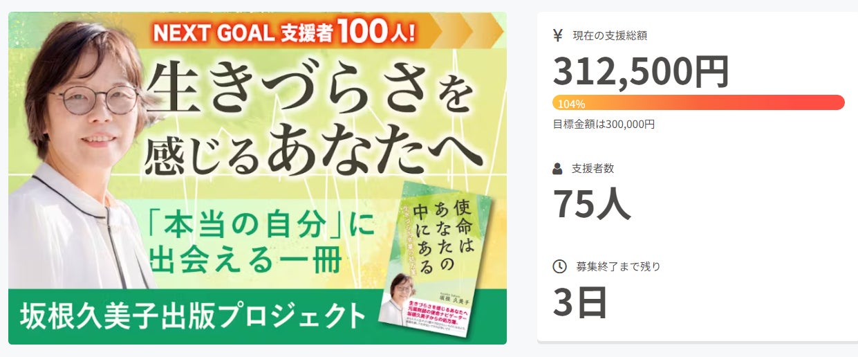 【あと2日!】1月18日にスタートしたプロジェクトですが、あと2日となりました。皆様のおかげで目標金額の30万円を達成することができました。ご支援いただいた資金は、書籍出版、サブスク動画制作に、大切に使わせていただきます。サブスク動画で見たいテーマがございましたら、メール、メッセージや公式Lineから教えてください。生きづらさ卒業のヒントになるよう、出来る限りご希望に沿う内容にしたいと思います。クラウドファンディング終了まであと2日です。最後の最後まで走りきるため、ネクストゴールにチャレンジいたします!ネクストゴールは支援者100人です!現在79人、あと21人。せっかくいただいたこの機会に、最後までチャレンジを続けたいと思います。どうぞよろしくお願いいたします。