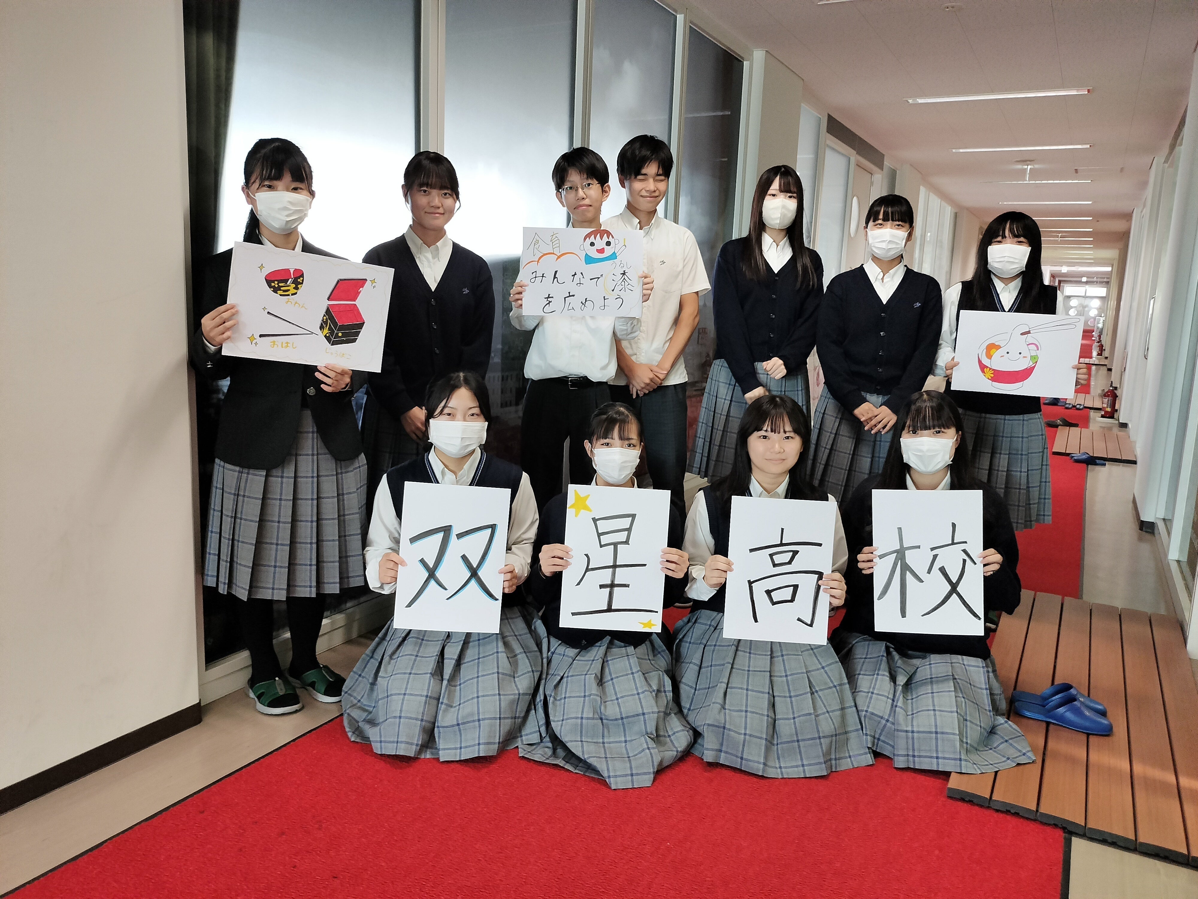 尼崎双星高校商業科では3年次に課題研究に取り組んでいます。私たちのグループは「漆の文化を守る」をテーマに、今の私たちにできることを考えました。もっとも身近な漆器といえば「お箸」です。日本人のほとんどの人がほぼ毎日お箸を使います。しかしお箸をただ売るだけでは人々の印象には残りづらいです。そこで私たちは食育とからめて保育園児に漆塗りのお箸を配り、園児のみならず、その保護者にも関心をもってもらおうと考えました。
