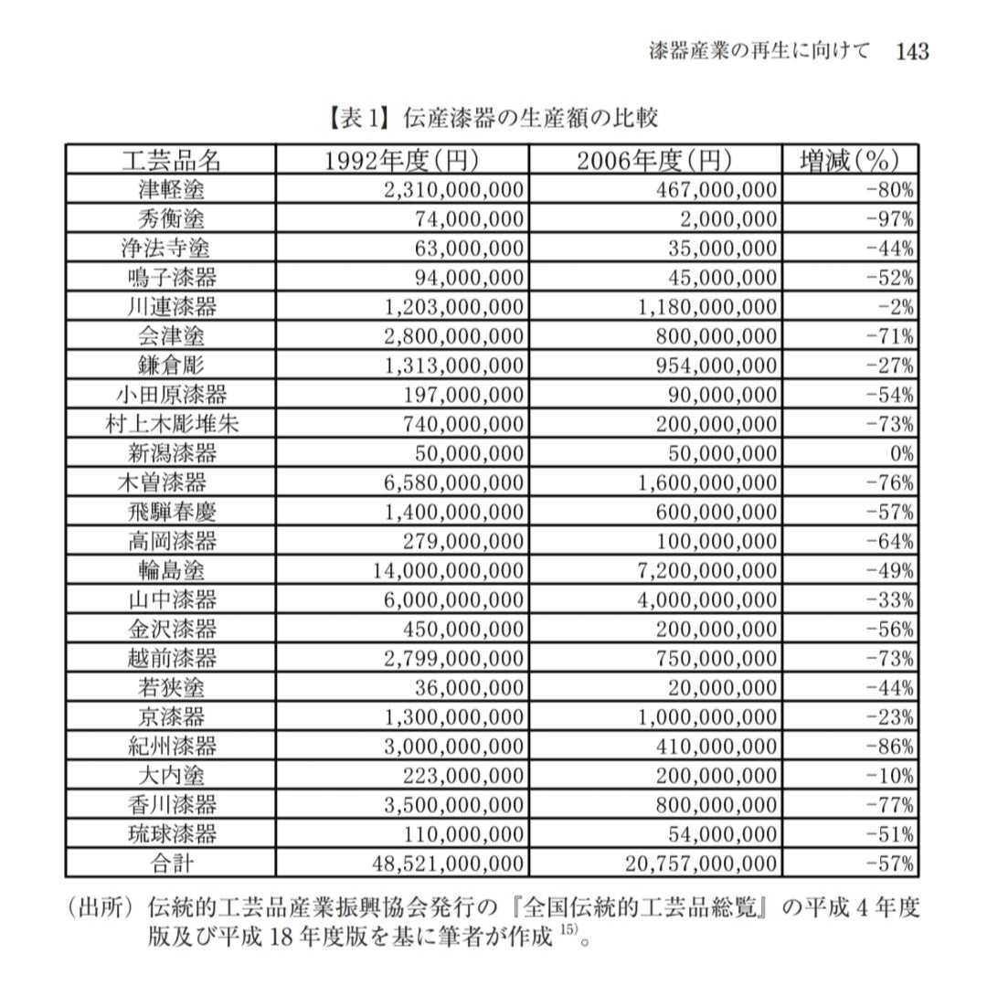 上の表は各漆器の産地における生産額の変化を示しています。