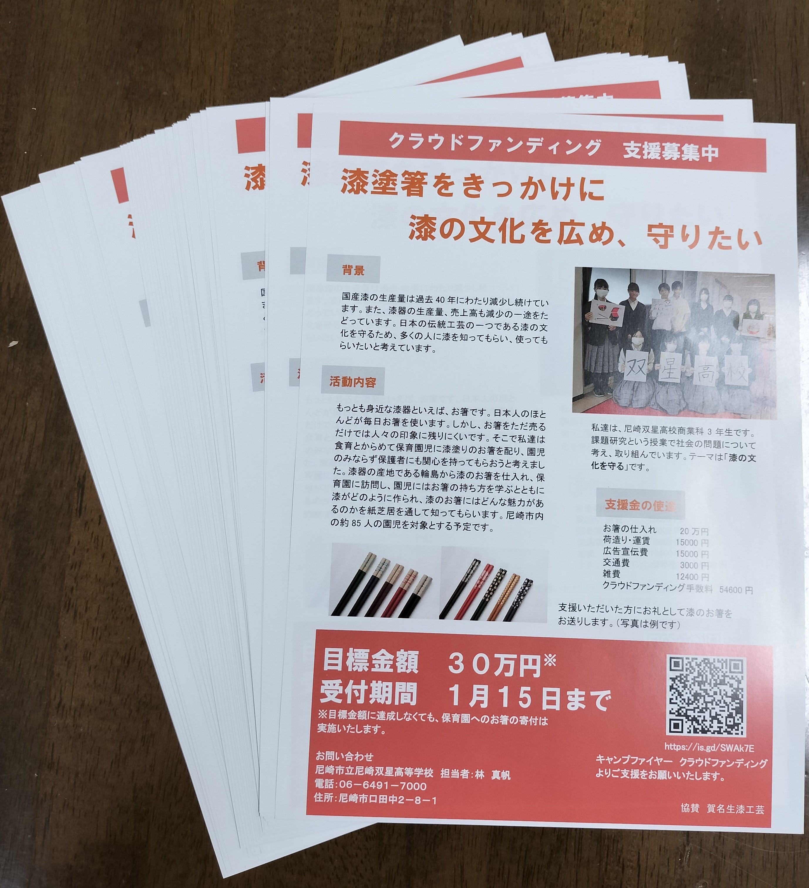 高校生がチラシを作成してくれました。このチラシは駅前、学校での配布のほか、尼崎市の商工会議所にもご協力いただき今回の活動を宣伝していただきます。近いうちに、高校生がJR尼崎、JR塚口、阪急武庫之荘駅で配布予定ですので、見かけられたらぜひお声がけください。
