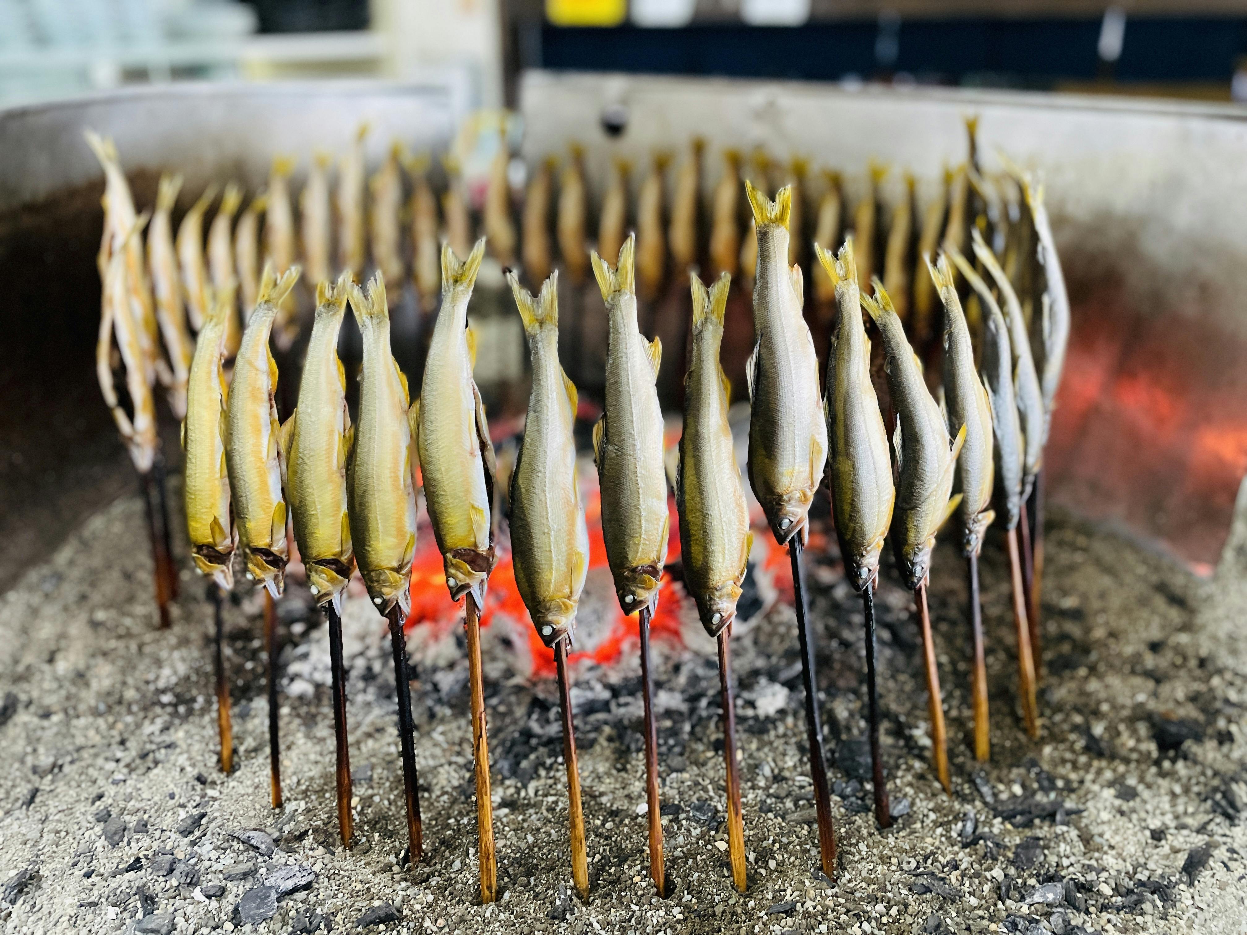 何度も研究を重ねるうち、鮎を焼き干す前に内臓を丁寧に取り除き、旨味であるぬめりを残して塩水で洗う一手間を加えることにしました。出汁に苦味が出ないようにする一工夫です。囲炉裏で鮎をまんべんなく炭火でじっくり焼くこと2時間。鮎を焦がさぬよう気をつけます。