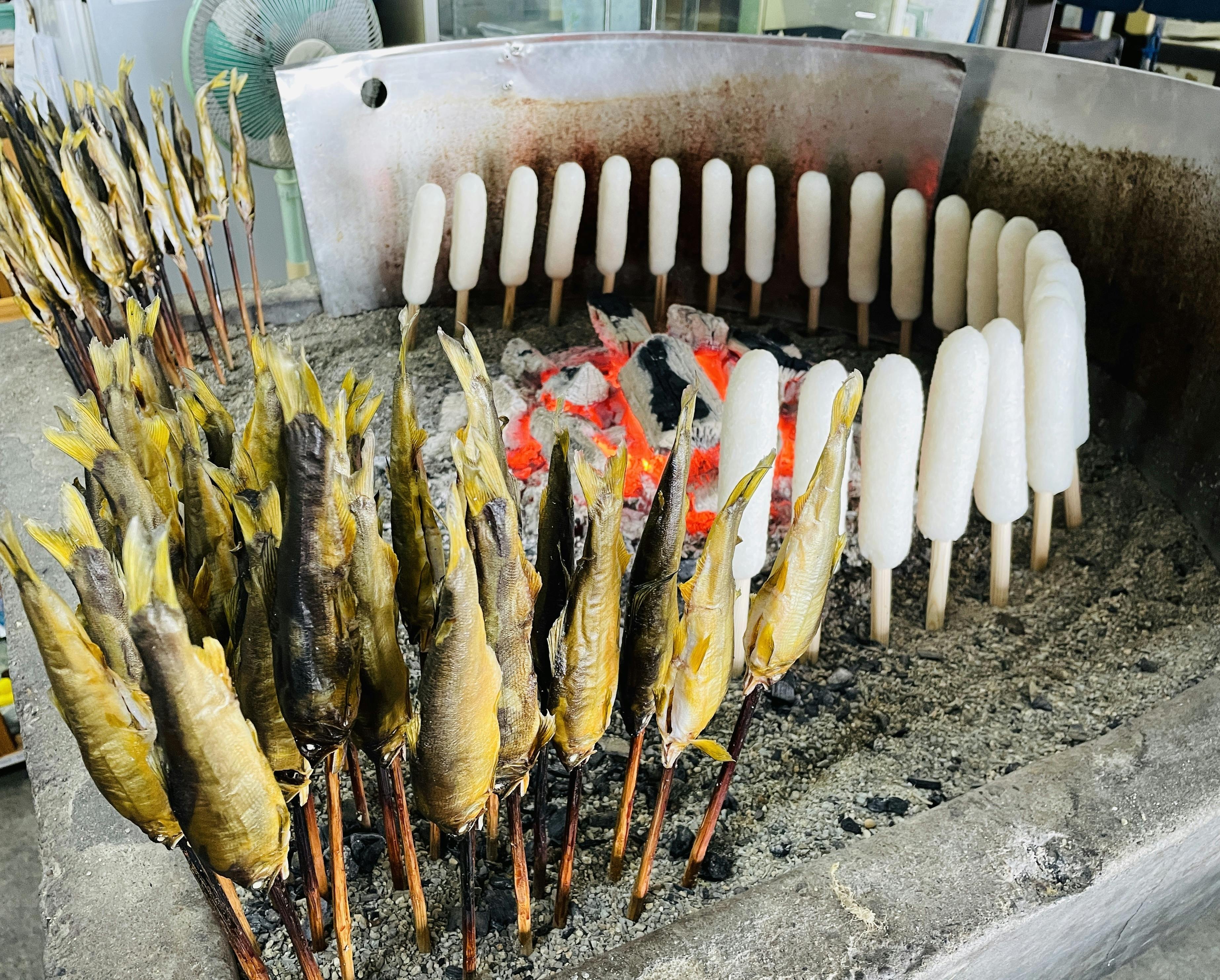 きりたんぽの仕上げの焼きは、鮎と同様炭火焼です。良い色合いまでじっくり、ふっくら香ばしく焼き上げます。囲炉裏には一度に20本も刺さらないので、この作業を何度か繰り返しても、きりたんぽを作るのは1日数十本を作るのが限界です。