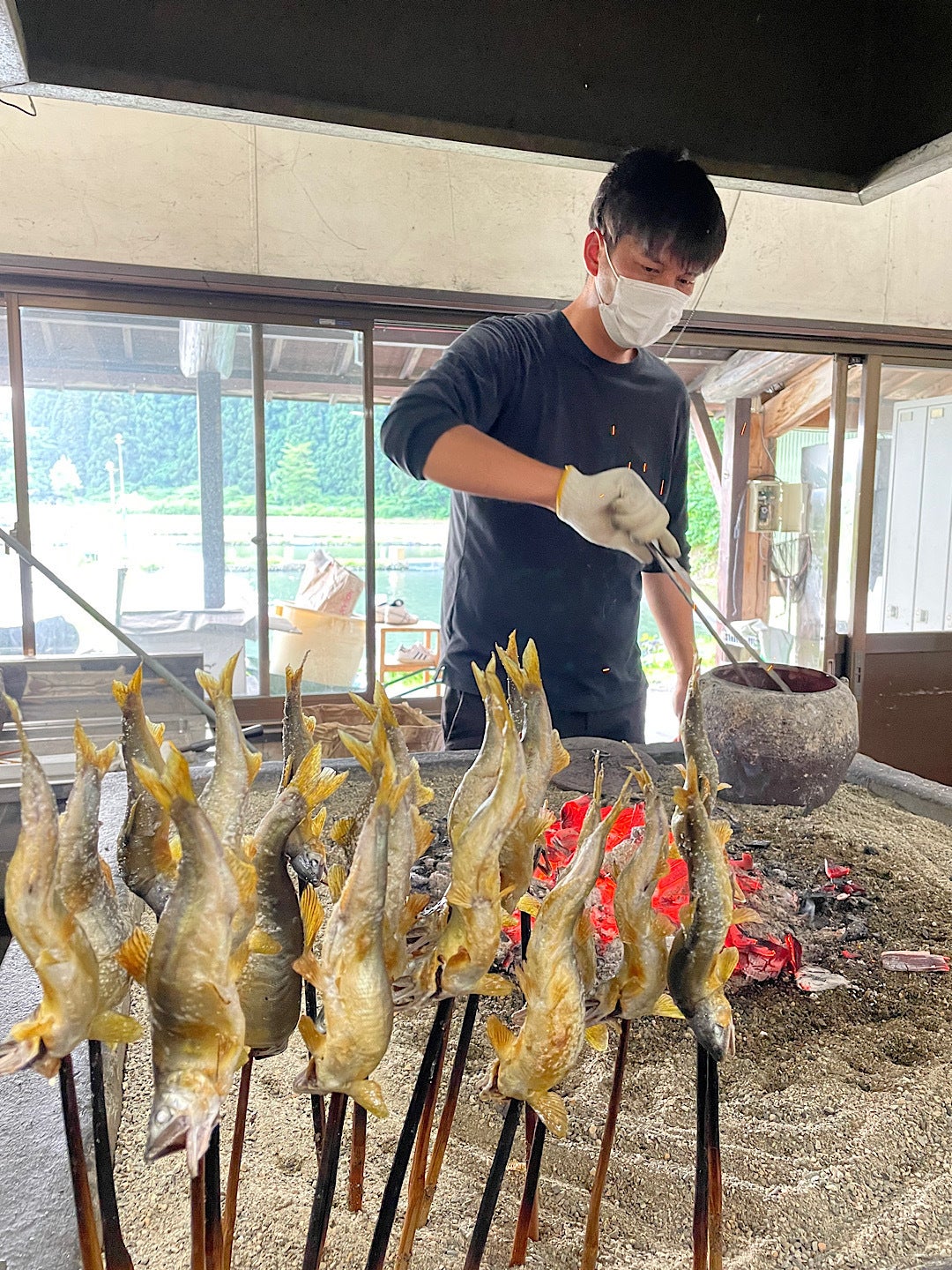 何度も研究を重ねるうち、鮎を焼き干す前に内臓を丁寧に取り除き、旨味であるぬめりを残して塩水で洗う一手間を加えることにしました。出汁に苦味が出ないようにする一工夫です。囲炉裏で鮎をまんべんなく炭火でじっくり焼くこと2時間。鮎を焦がさぬよう気をつけます。