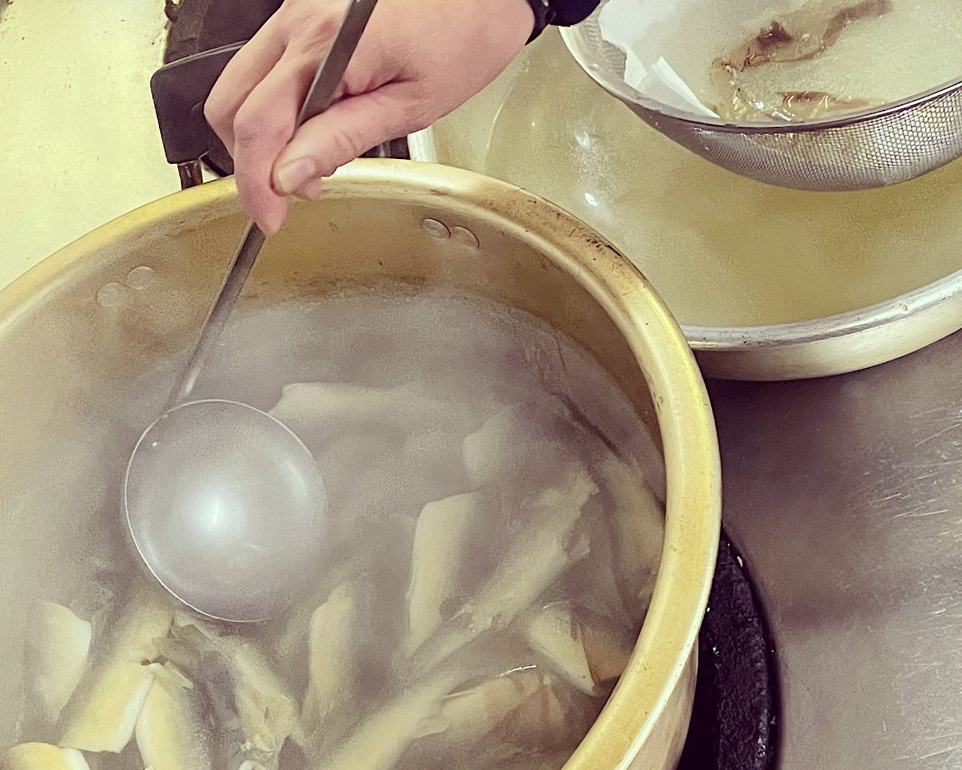 下処理した鮎と昆布を水からコトコト火にかけ、煮立つ前に昆布を取り出し丁寧にアクを取りながらさらにコトコト1時間。最後に濾し器で濾して、地元の調味料で味付けし、幻の黄金スープが完成します。時間をかけて焼き干しした鮎でとった鮎出汁は、口の中から鼻にぬける鮎の風味がなんとも言えず上品な味わいに仕上がりました。
