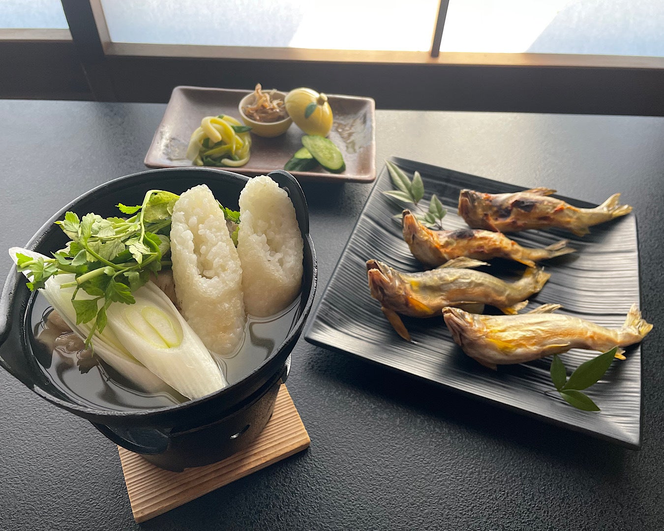 鮎出汁きりたんぽとネットで大好評の解凍不要”温めるだけで名店の味”シリーズの鮎の塩焼きと燻製をセットにしました。
